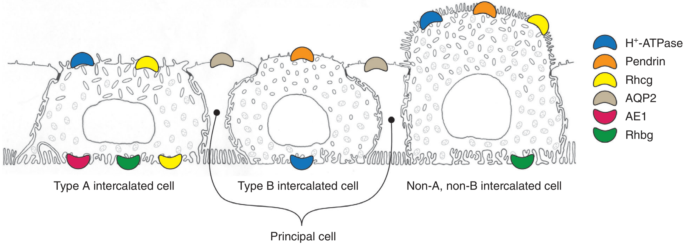 Fig. 9.3 — Three intercalated cell subtypes. Type A (α-IC): apical H⁺-ATPase + basolateral AE1 (kAE1, pink) + basolateral Rhbg (green). H⁺-K⁺-ATPase not depicted here but is co-expressed apically. — Brenner & Rector's The Kidney