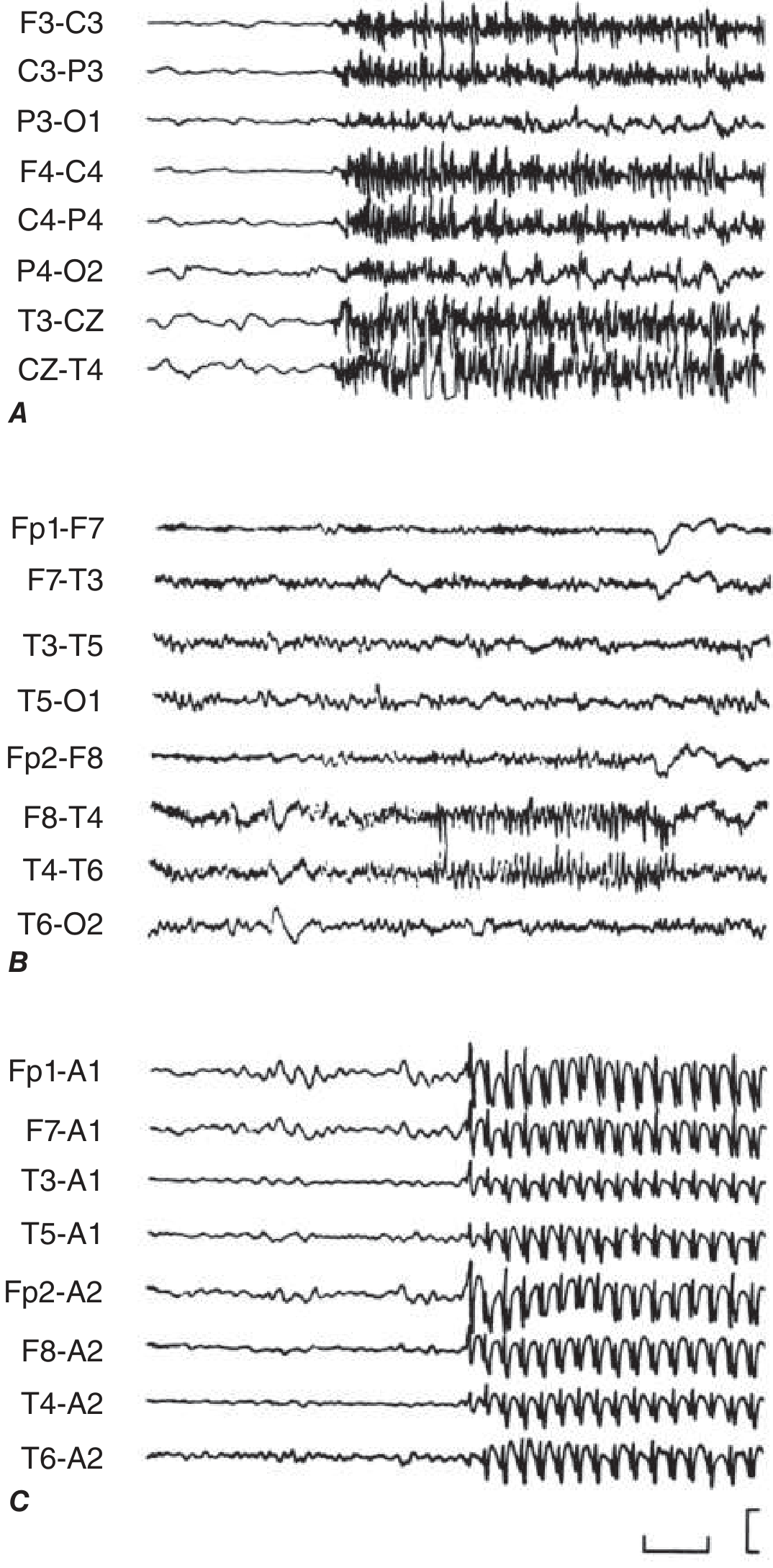 Figure: Electrographic seizures. A. Generalised tonic seizure showing synchronous sharp activity. B. Right temporal focal discharge during impaired awareness. C. 3-Hz spike-wave of absence seizure. — Harrison's 22E