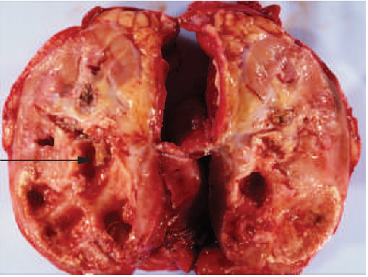 Xanthogranulomatous pyelonephritis: extensive destruction of renal parenchyma. Arrow points to depression left by a staghorn calculus that has been removed. — Harrison's Principles of Internal Medicine 22E