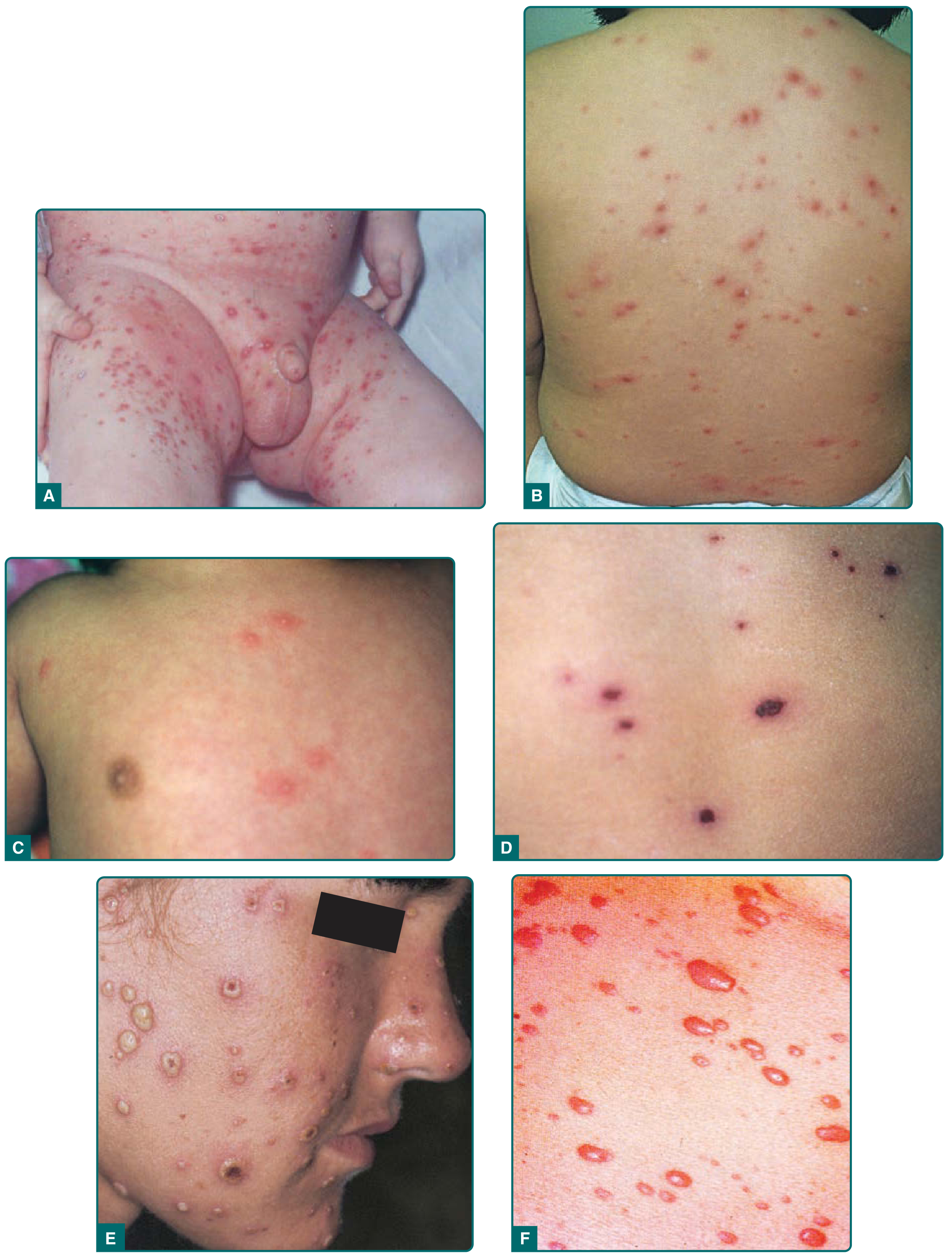 | Vesicle | 2–3 mm, thin-walled, elliptical; long axis parallel to skin folds; surrounded by irregular erythema — classic "dewdrop on a rose petal" appearance |