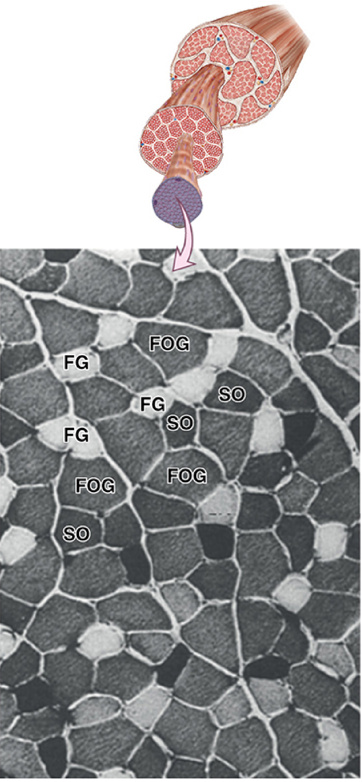 Cross-section of skeletal muscle stained for myosin ATPase at acidic pH. SO fibers (Type I) stain darkest; FG fibers (Type IIb) stain lightest; FOG fibers (Type IIa) show intermediate staining. (×40)