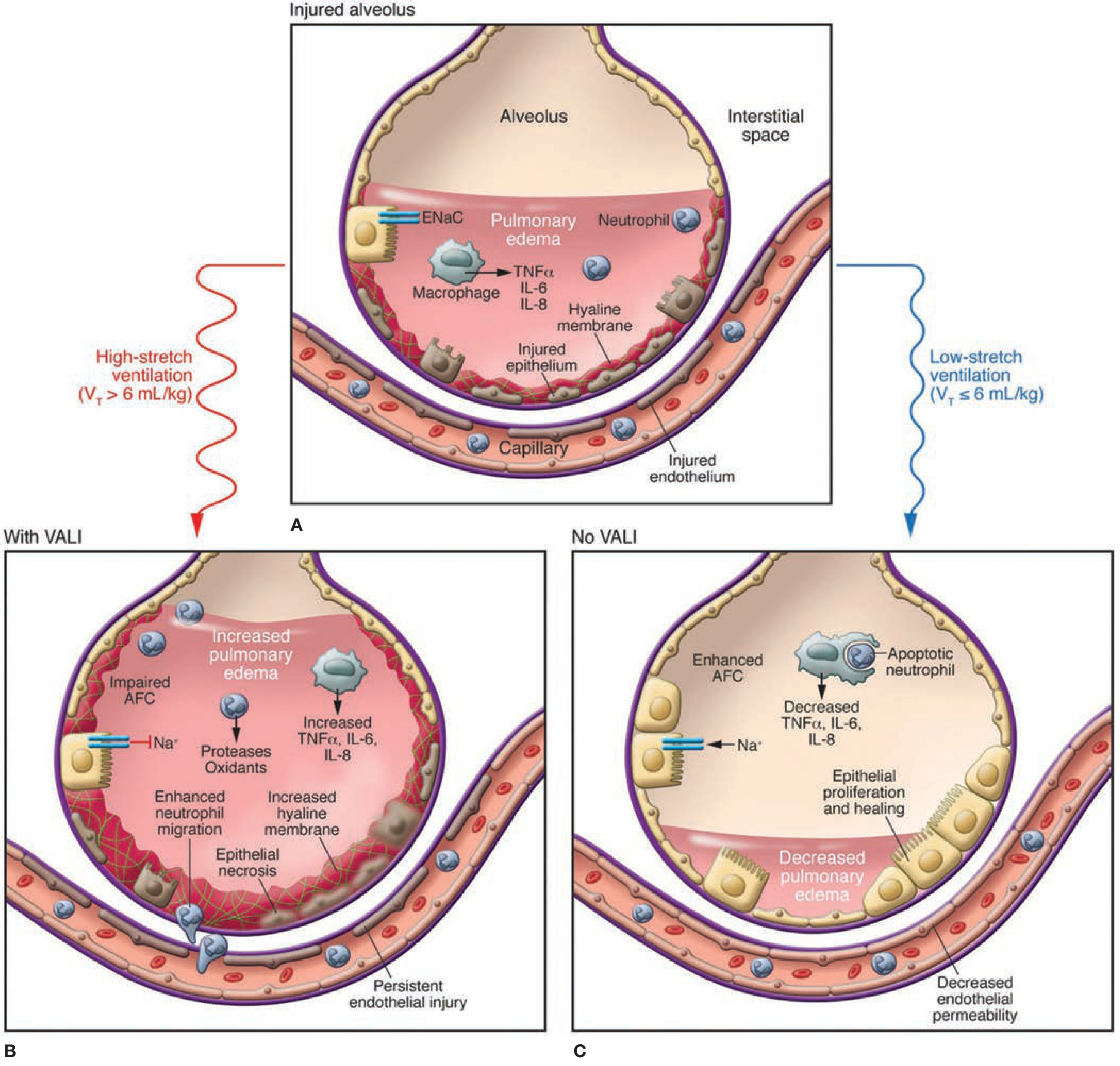 This is why low tidal volume ventilation (6 mL/kg IBW, plateau pressure ≤30 cmH₂O) is the only ventilatory strategy with proven mortality benefit. — Fishman's VALI diagram, p. 2485; Sabiston, p. 940