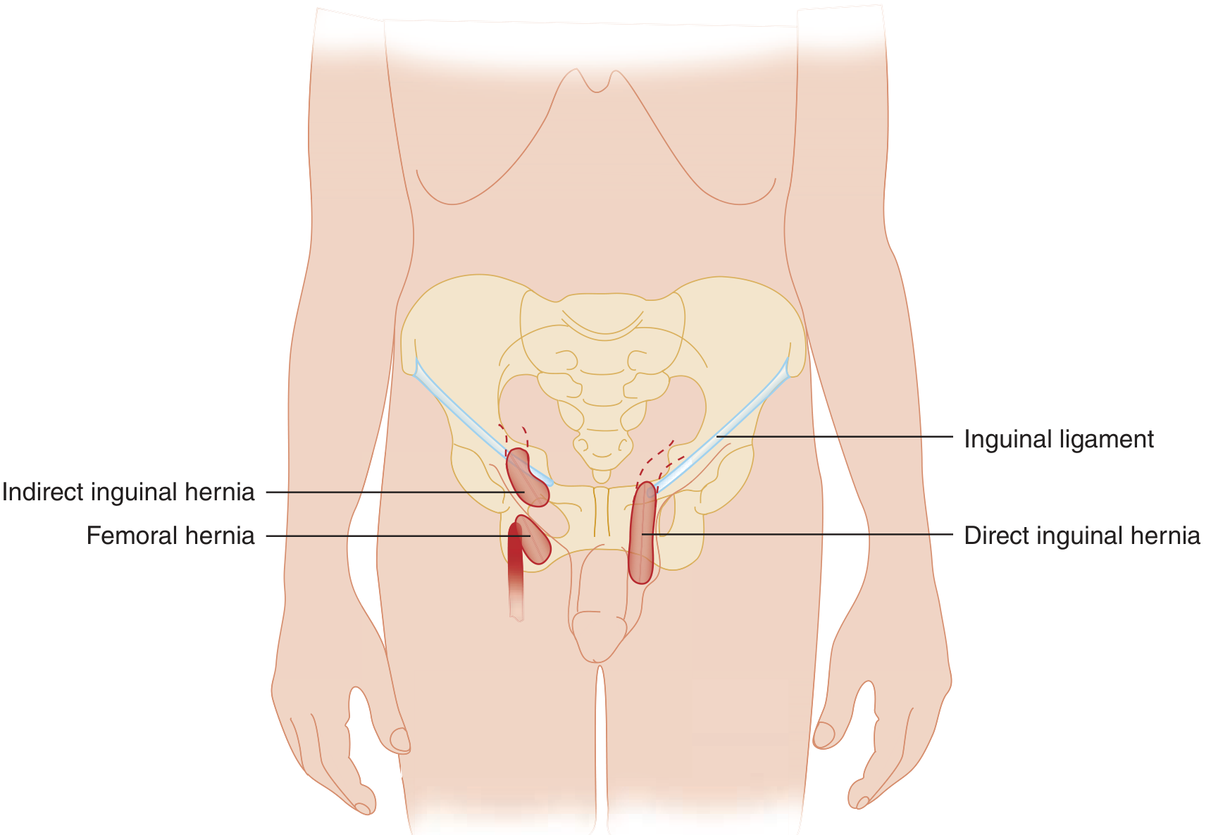 | Bowel loop in inguinal canal | Hernia (bowel hernia) |