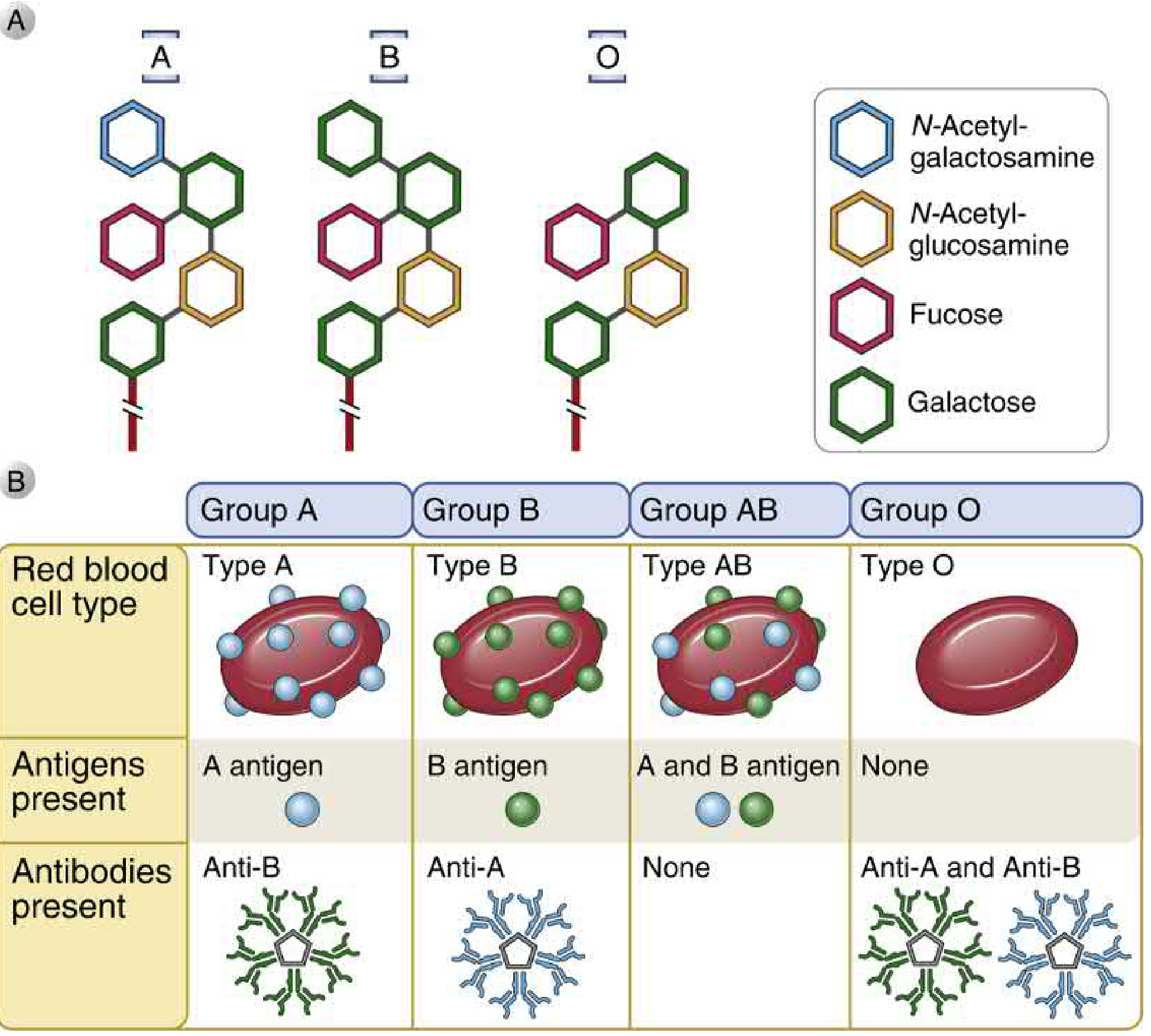 Figure: ABO blood group antigen structures (top) and the corresponding antigens/antibodies present in each blood type (bottom). — Cellular and Molecular Immunology