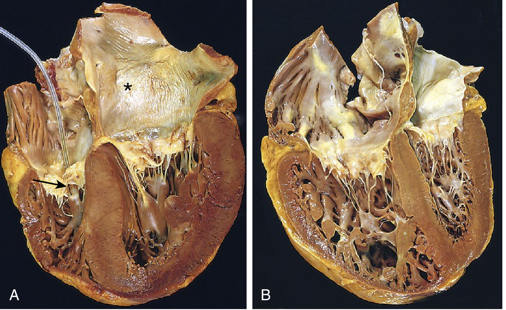 Robbins & Kumar Basic Pathology — (B) Chronic cor pulmonale: markedly dilated and hypertrophied right ventricle (left side), distorting the left ventricle