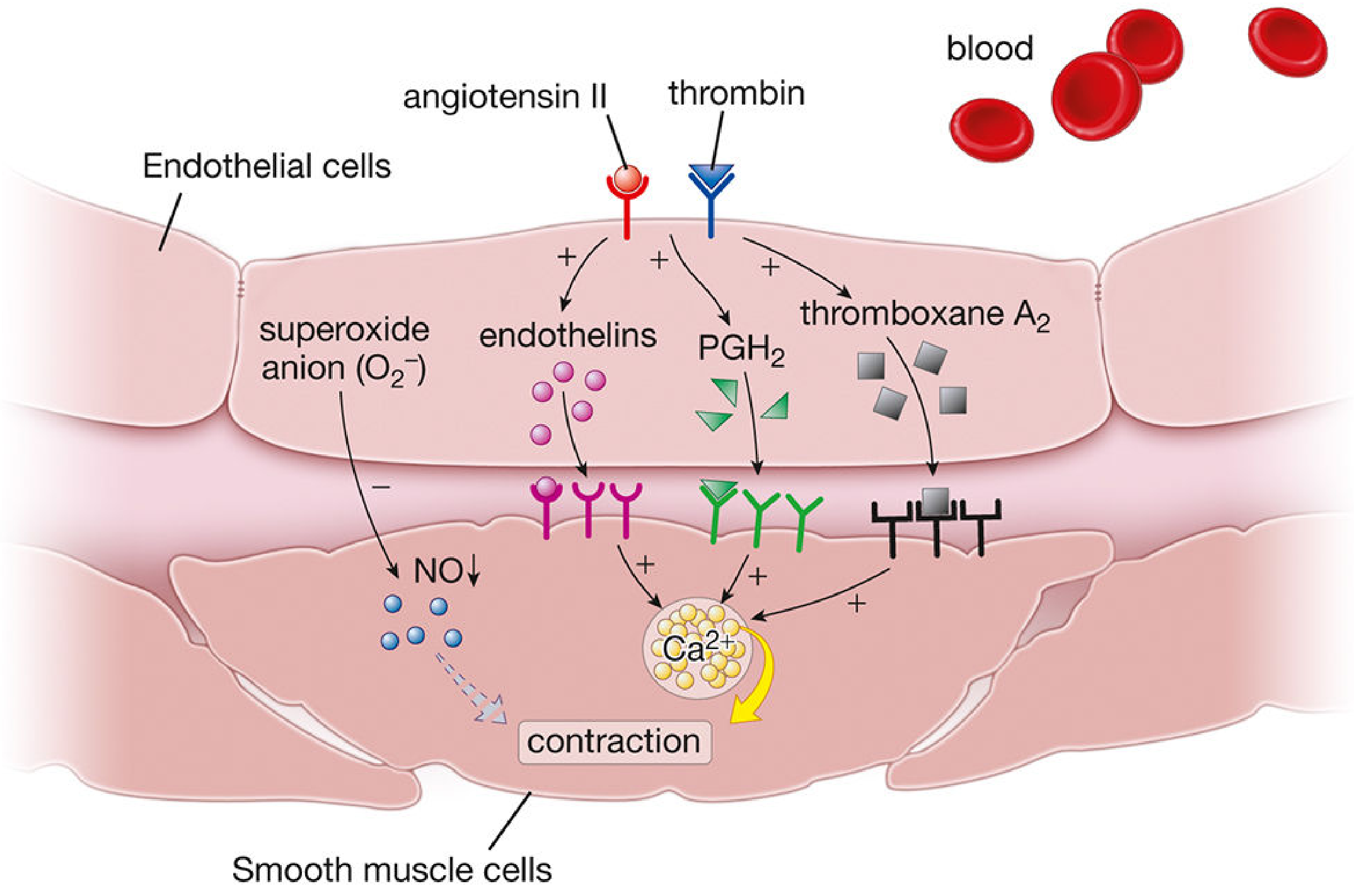 | PGH₂ | Endothelium | TP | ↑Ca²⁺ → contraction |