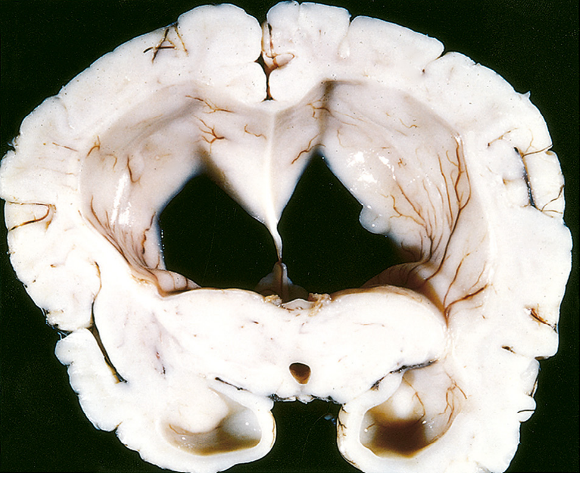 Dilated lateral ventricles in a brain with atrophy (hydrocephalus ex vacuo), coronal section — Robbins, Cotran & Kumar