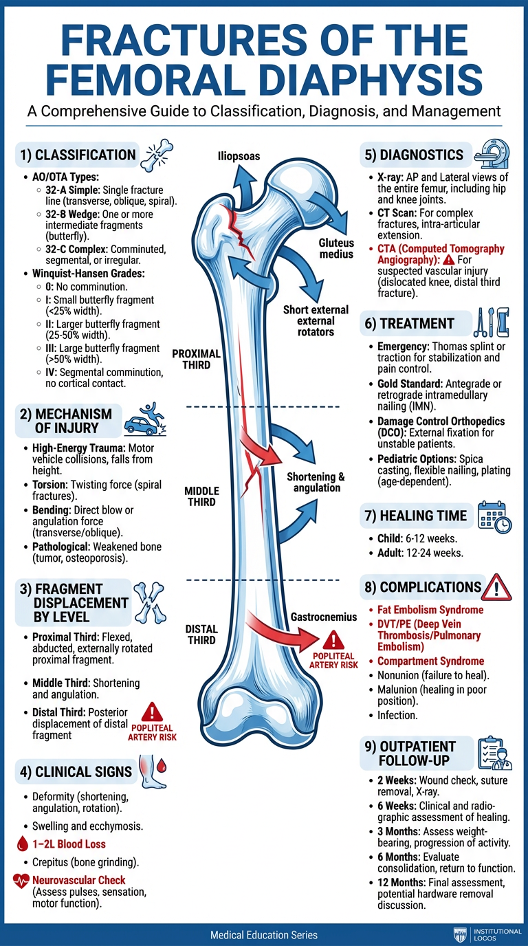 | Most dangerous displacement | Distal third — posterior displacement, popliteal artery risk |