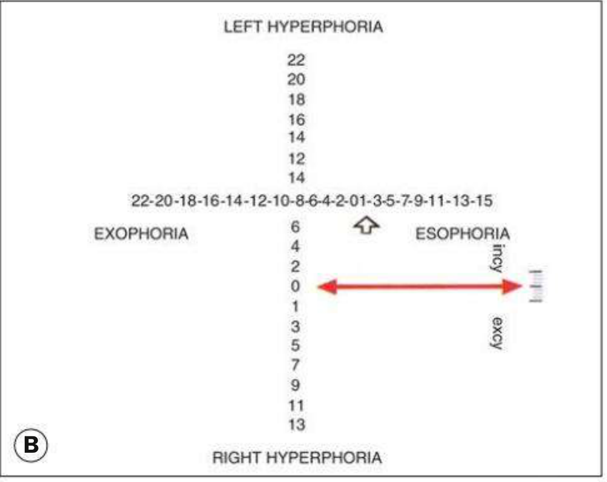 Fig. 18.35 — Patient's view using the Maddox wing, showing horizontal (esophoria/exophoria) and vertical (hyperphoria) scales.