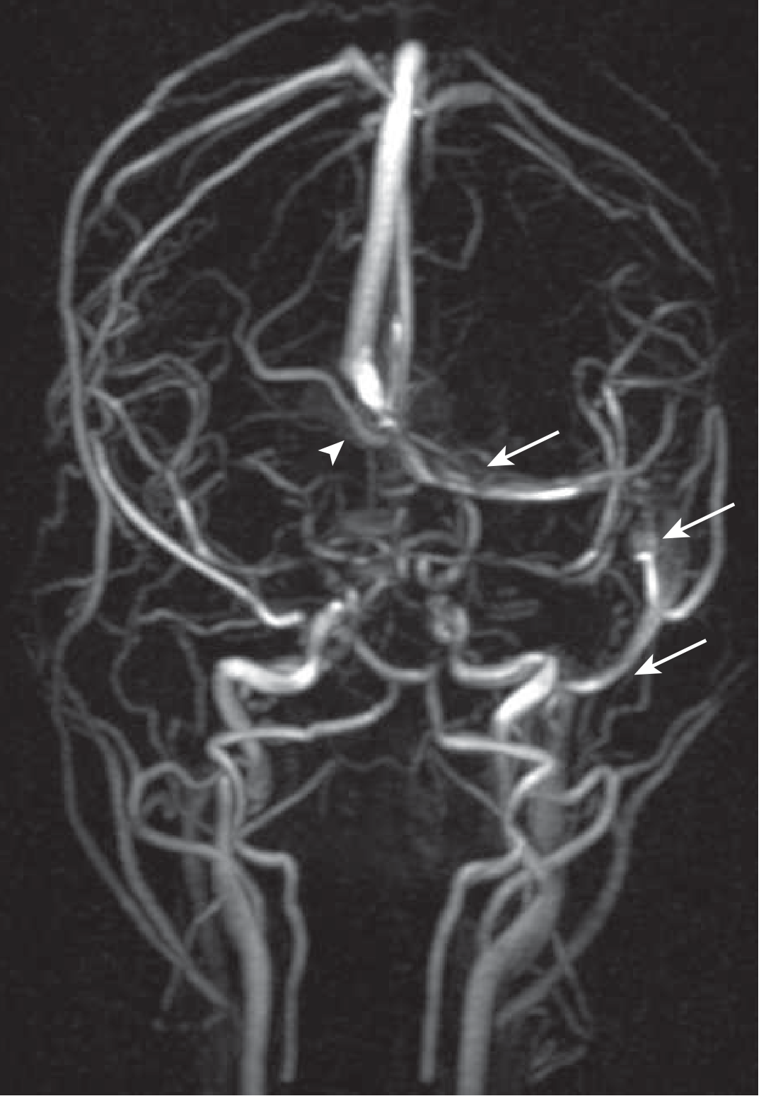 MR venogram: absent flow in right transverse sinus (arrowhead) and sigmoid sinus; intact left-sided flow (arrows). — Goldman-Cecil Medicine, Fig. 376-6
