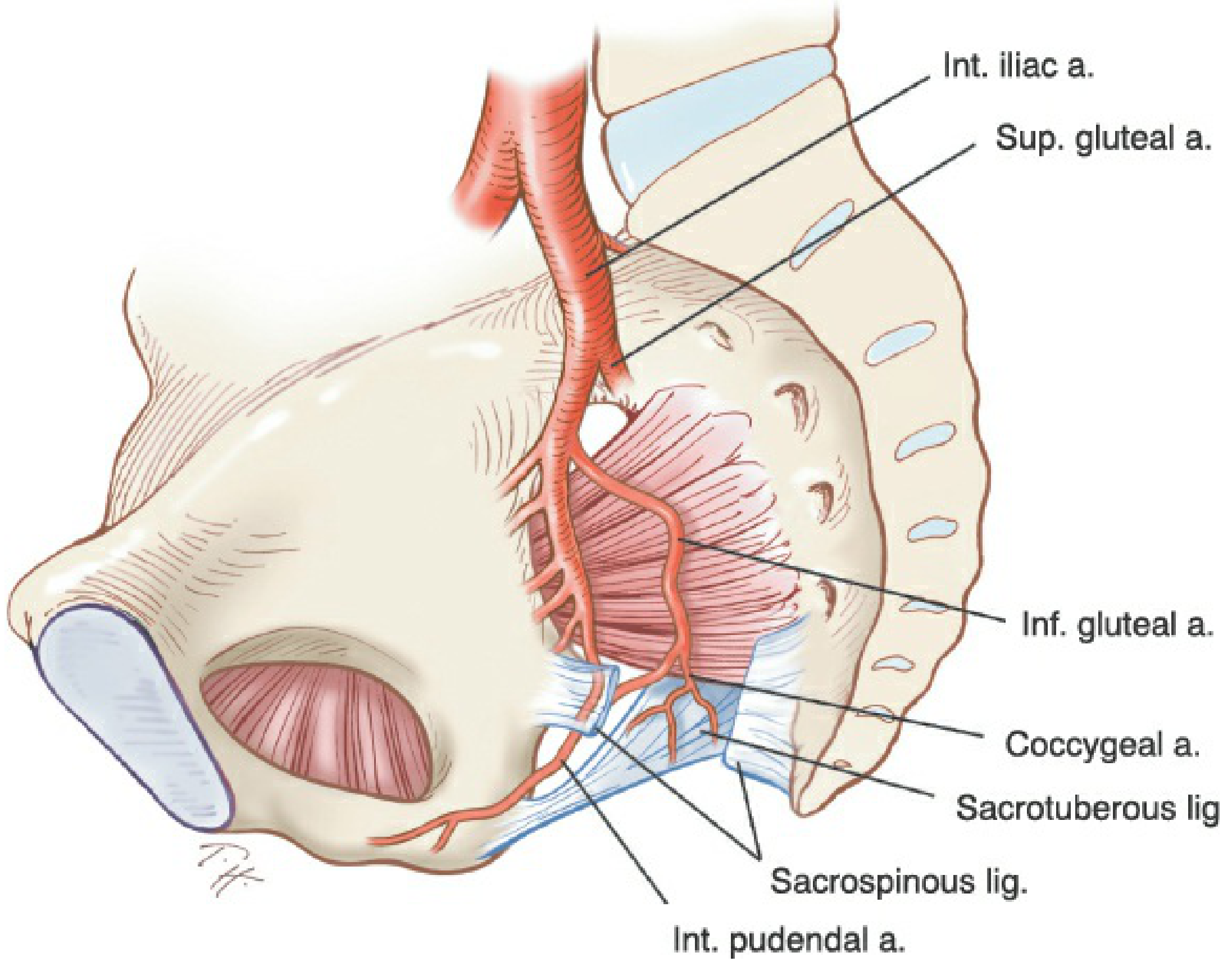 - The inferior gluteal artery (lies between the sacrospinous and sacrotuberous ligaments)