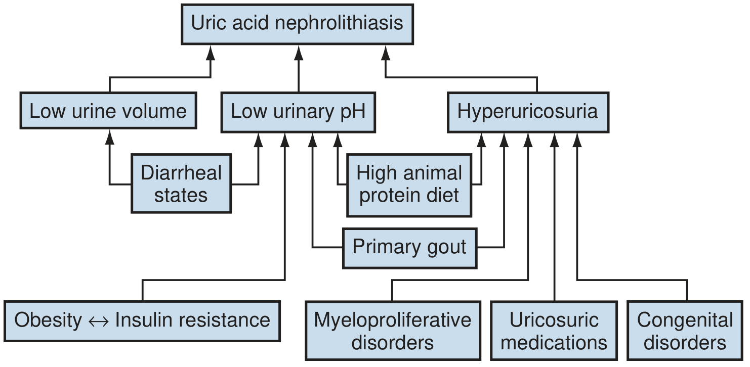 "Uric acid stone formers have been found to share many of the characteristic features of metabolic syndrome, including hypertriglyceridemia, hyperglycemia, obesity, and hypertension." — Campbell-Walsh-Wein Urology