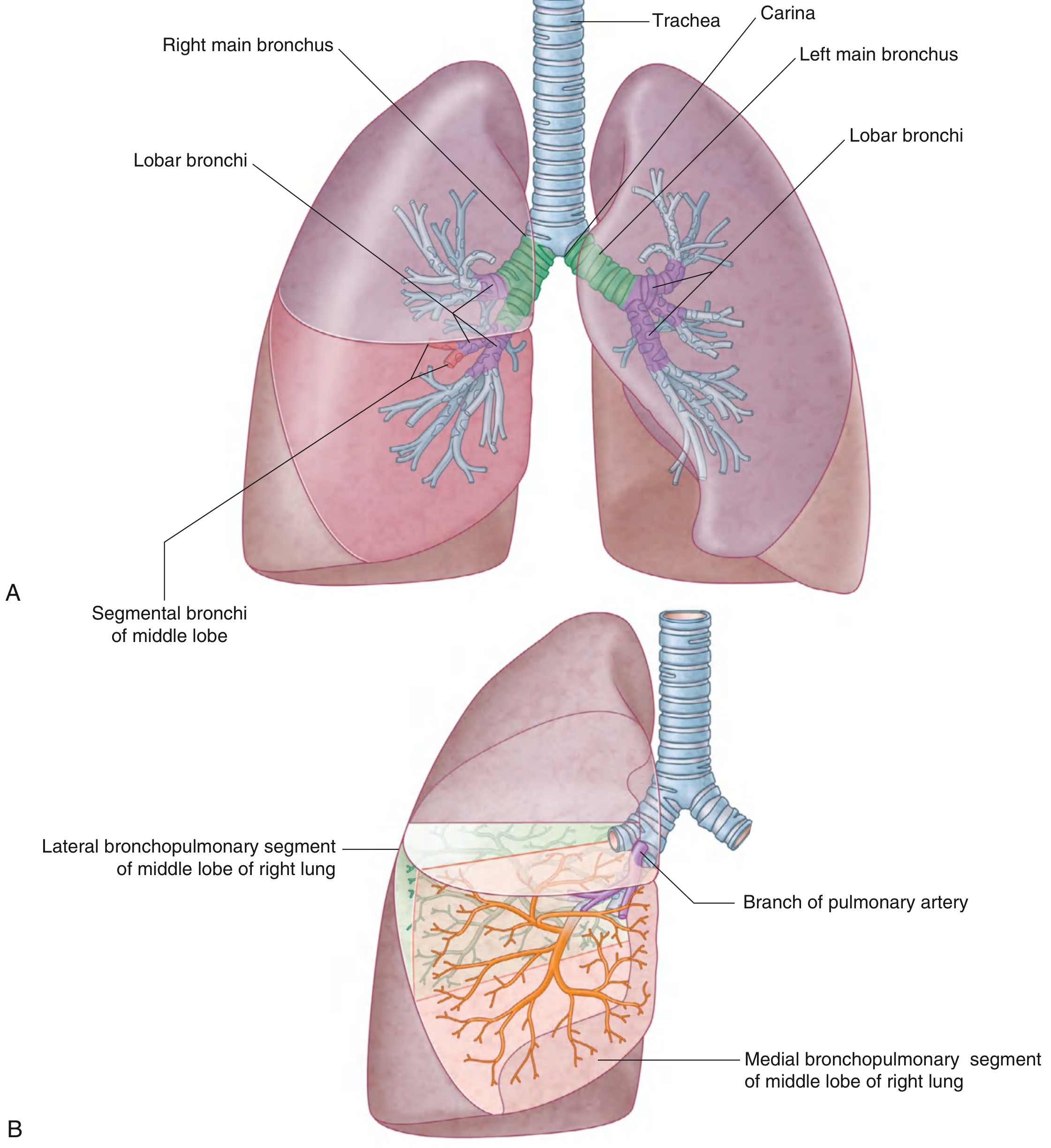 Fig. 3.48 Bronchial tree (A) and bronchopulmonary segments (B) — Gray's Anatomy for Students