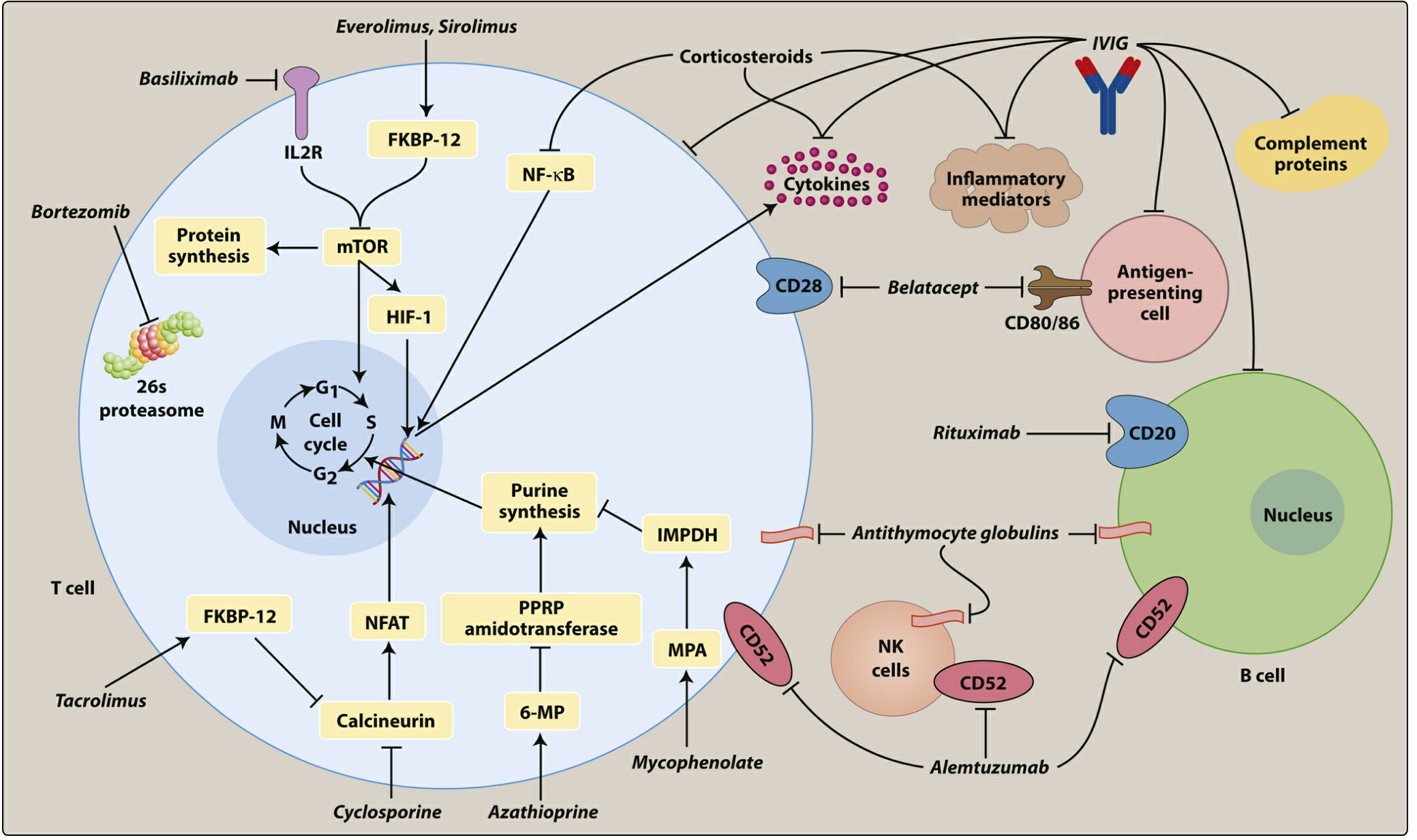 Corticosteroids inhibit NF-κB → reduce cytokines and inflammatory mediators. IL-2R = interleukin-2 receptor; NFAT = nuclear factor of activated T cells; mTOR = mammalian target of rapamycin.