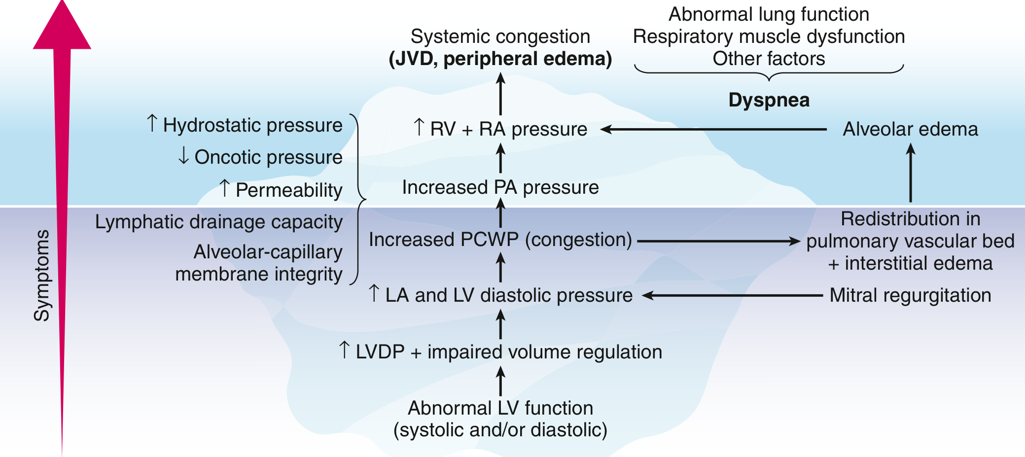 Abnormal LV function → ↑ LV diastolic pressure → ↑ LA pressure → ↑ pulmonary capillary wedge pressure (PCWP) → interstitial/alveolar edema → ↓ lung compliance → ↑ work of breathing → dyspnea