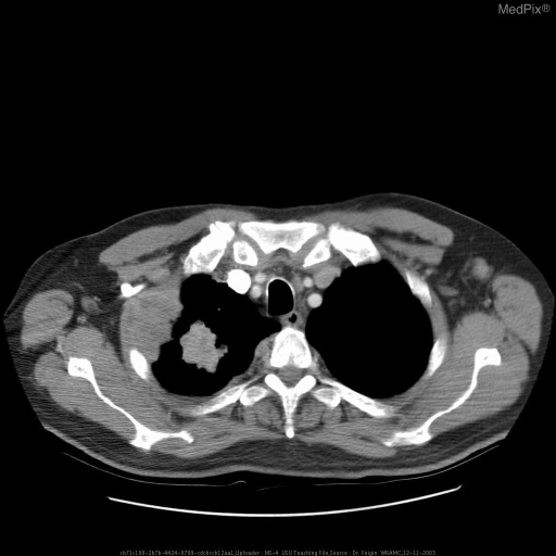 Axial CT — spiculated right upper lobe mass, classic appearance of primary bronchogenic carcinoma