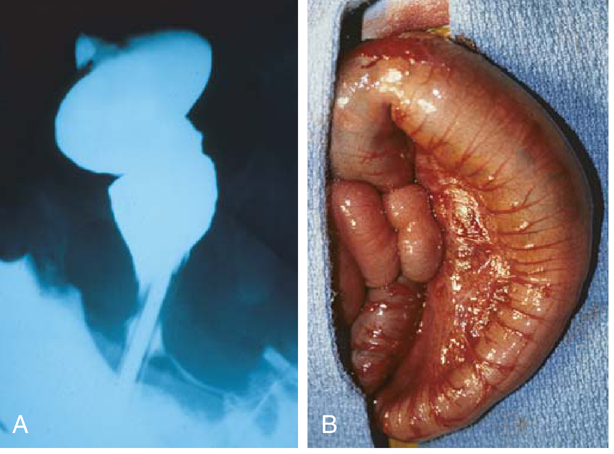 Hirschsprung disease: (A) preoperative barium enema showing constricted rectum (bottom) and dilated sigmoid colon; (B) intraoperative appearance of the massively dilated sigmoid colon. — Robbins & Kumar Basic Pathology