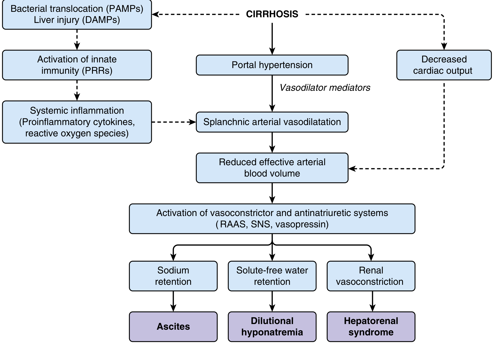- Results from portal hypertension → splanchnic vasodilation → RAAS/SNS activation → sodium and water retention