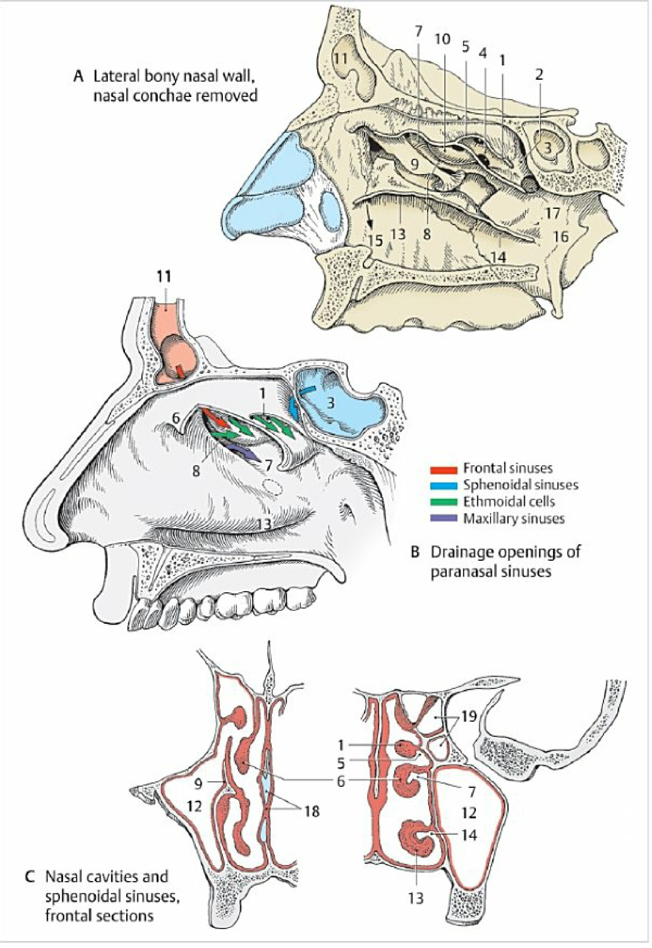 Nasal passages, their topography, which paranasal sinuses open in them.