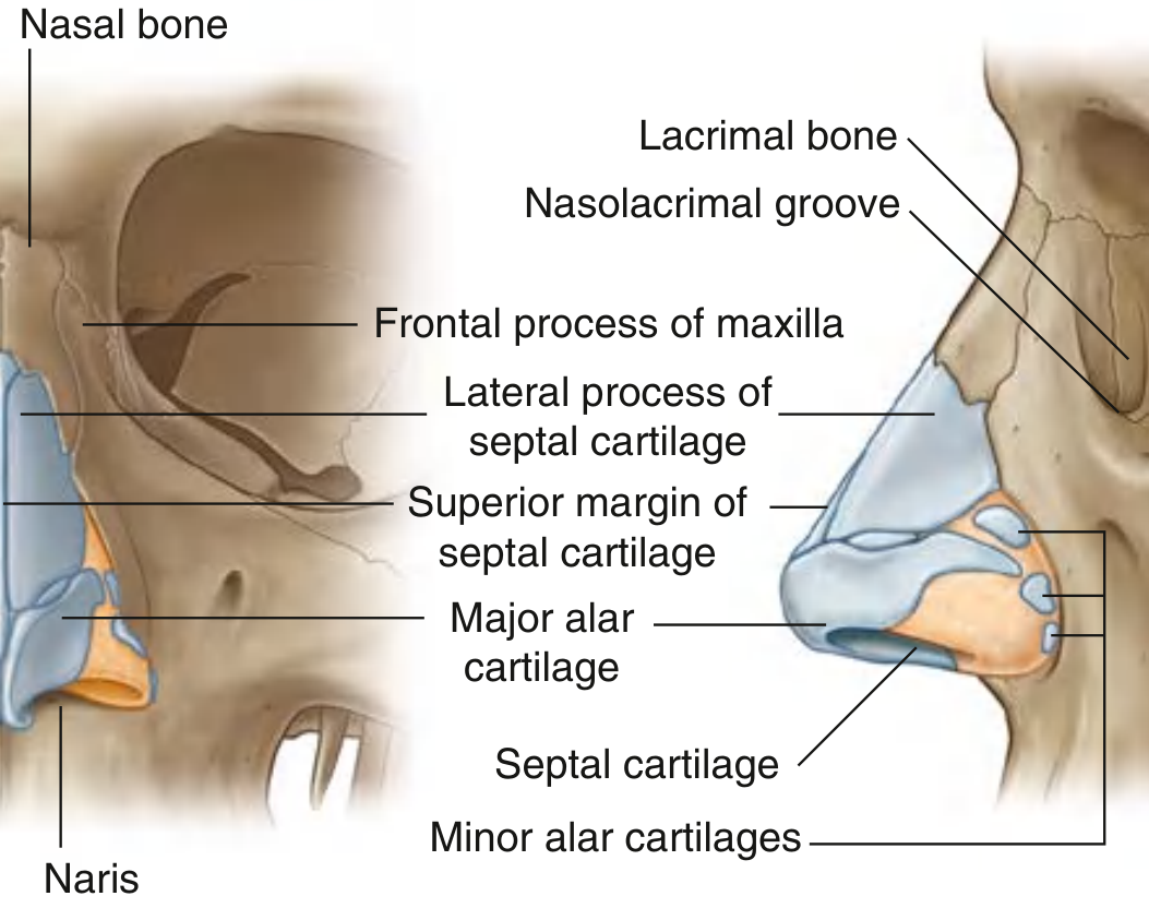 Cartilaginous part (anterior/inferior): septal cartilage, lateral nasal cartilages, major and minor alar cartilages