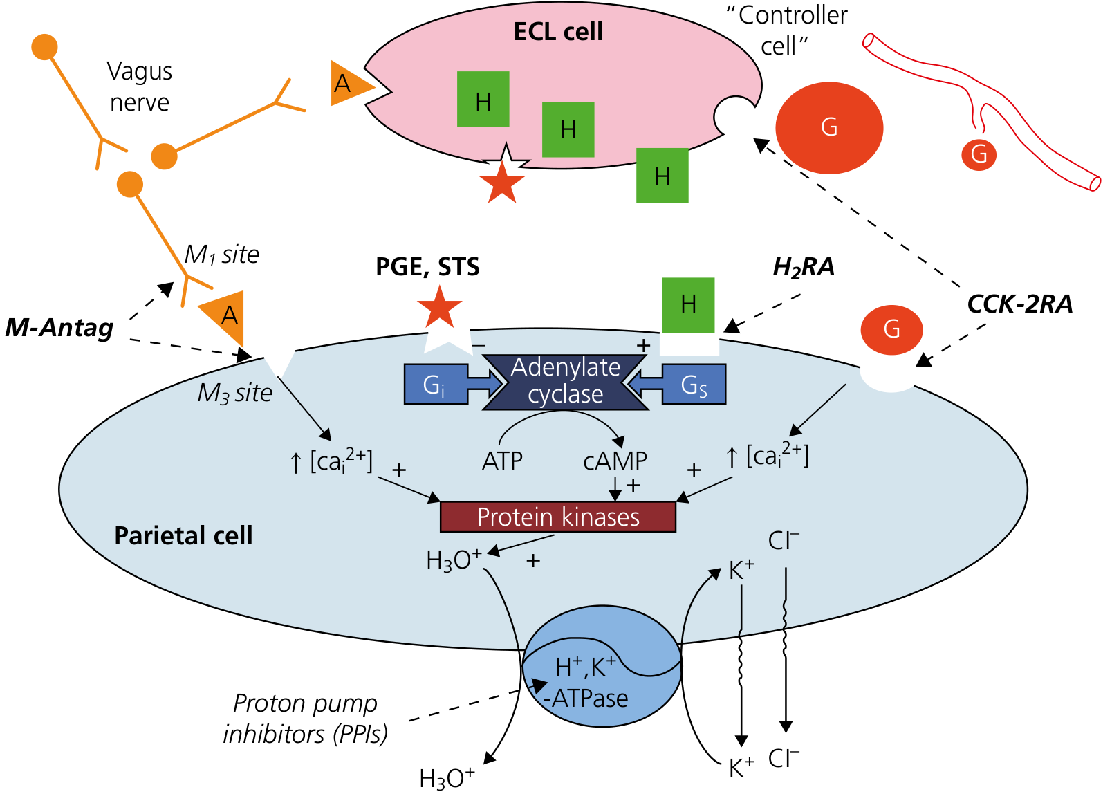 - The proton pump is H⁺-K⁺ ATPase — inhibited by PPIs (omeprazole, pantoprazole).
