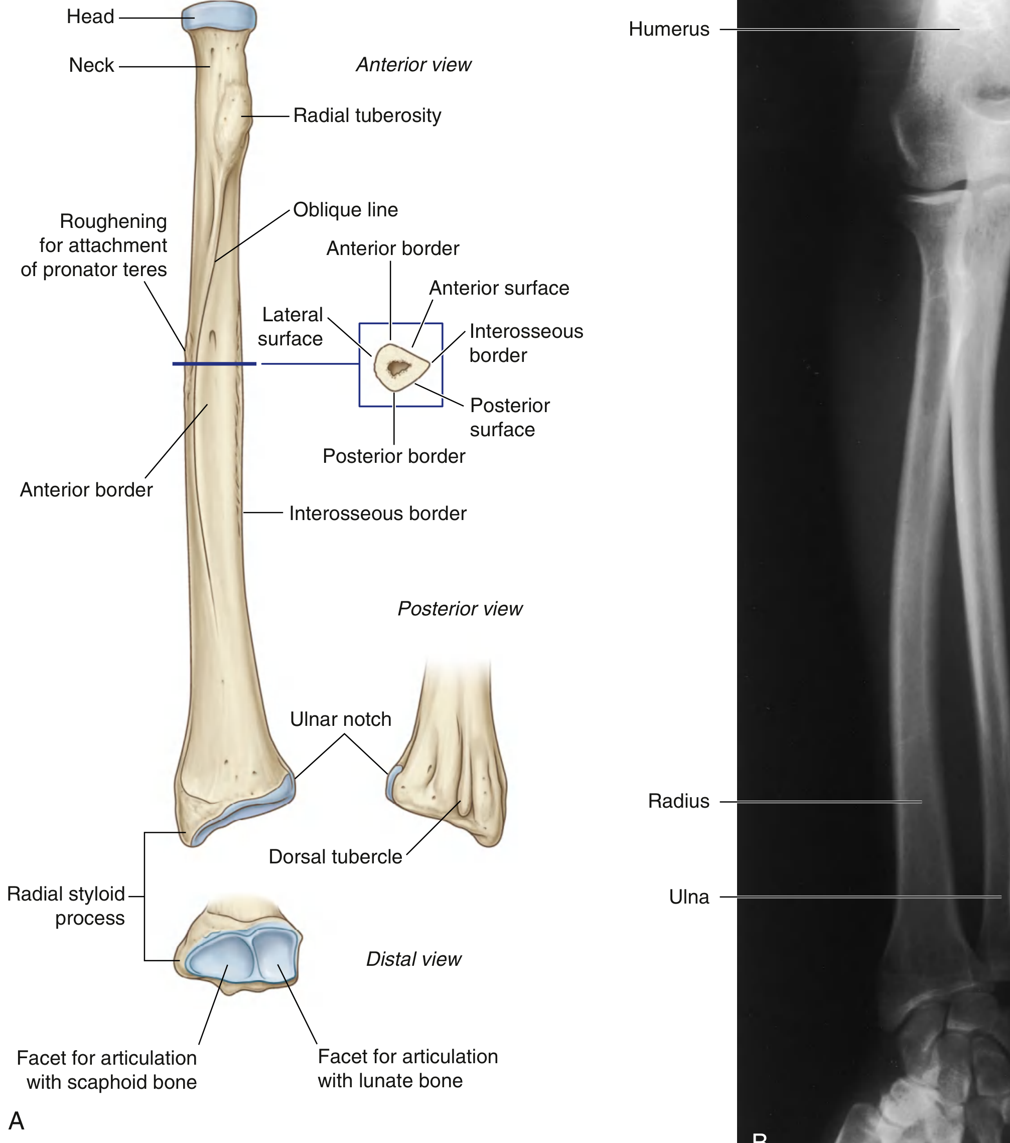 Q: Complete radius bone A: The radius is one of the two forearm bones, located on the thumb lateral side. Complete anatomy of the radius quick full summary - Type: Long bone - Position: Lateral forearm anatomical position - Shape pattern: - Small proximally - Broad distally forms most of wrist articulation Parts 1. Proximal end - Head of radius: disc-shaped; superior fovea articulates with capitulum of humerus - Neck of radius - Radial tuberosity: insertion of biceps brachii tendon 2. Shaft body - Triangular cross-section - 3 borders: anterior, posterior, interosseous - 3 surfaces: anterior, posterior, lateral - Interosseous border gives attachment to interosseous membrane between radius and ulna 3. Distal end - Radial styloid process lateral - Dorsal tubercle Lister tubercle posteriorly - Ulnar notch medially for distal radioulnar joint - Inferior articular facets for scaphoid and lunate radiocarpal joint Major articulations - Proximal radioulnar joint with ulna - Humeroradial joint with capitulum - Distal radioulnar joint - Radiocarpal joint with scaphoid and lunate Main functional points - Essential for pronation-supination of forearm - Transmits load from hand to elbow - Distal radius is a common fracture site for example, Colles fracture !Labeled radius anatomyhttps://cdn.orris.care/cdssimages/504cd7e53655965f9b83c8e575f294be885b1f4779e8135f435fc7bec2394fe0.png Source: Imaging anatomy text and atlas Volume 3, Bones, joints, Vessels and Nerves, p. 93-95; Gray's Anatomy for Students, p. 892-894.