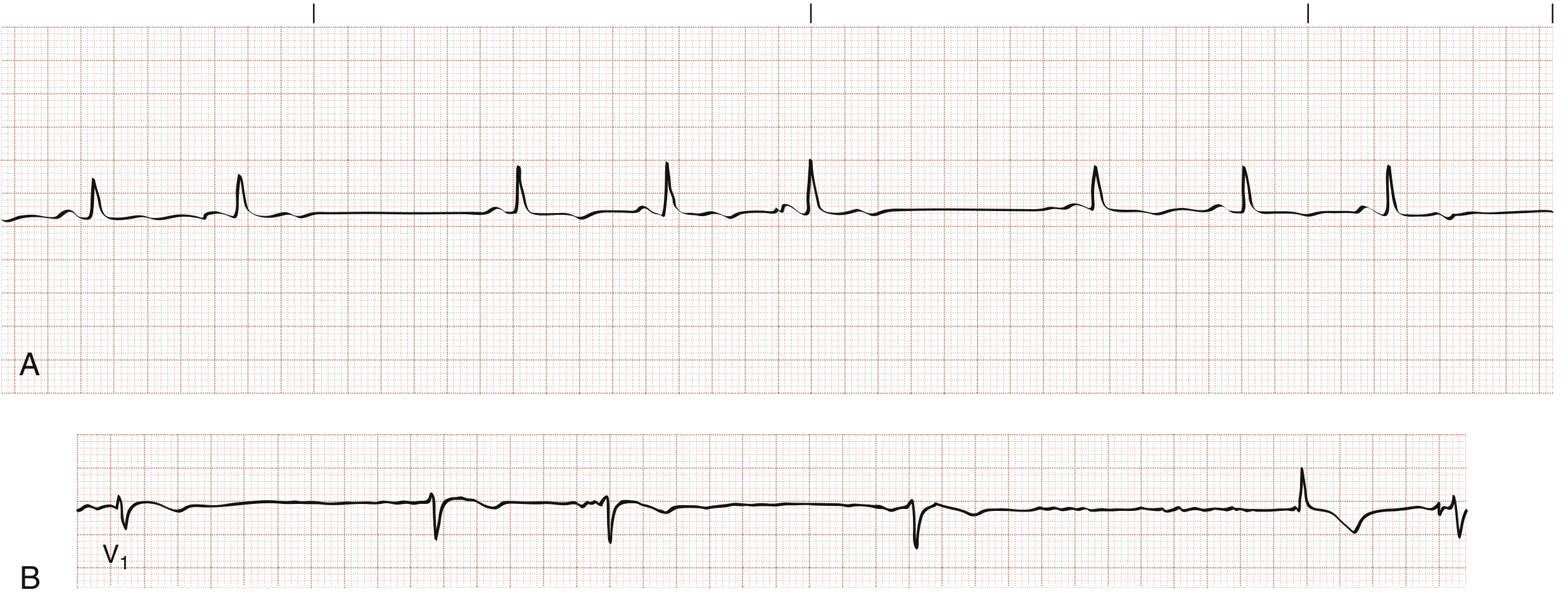 Fig. A: incomplete sinus block; B: complete sinus block (sinus arrest) with ventricular escape rhythm — Rosen's Emergency Medicine