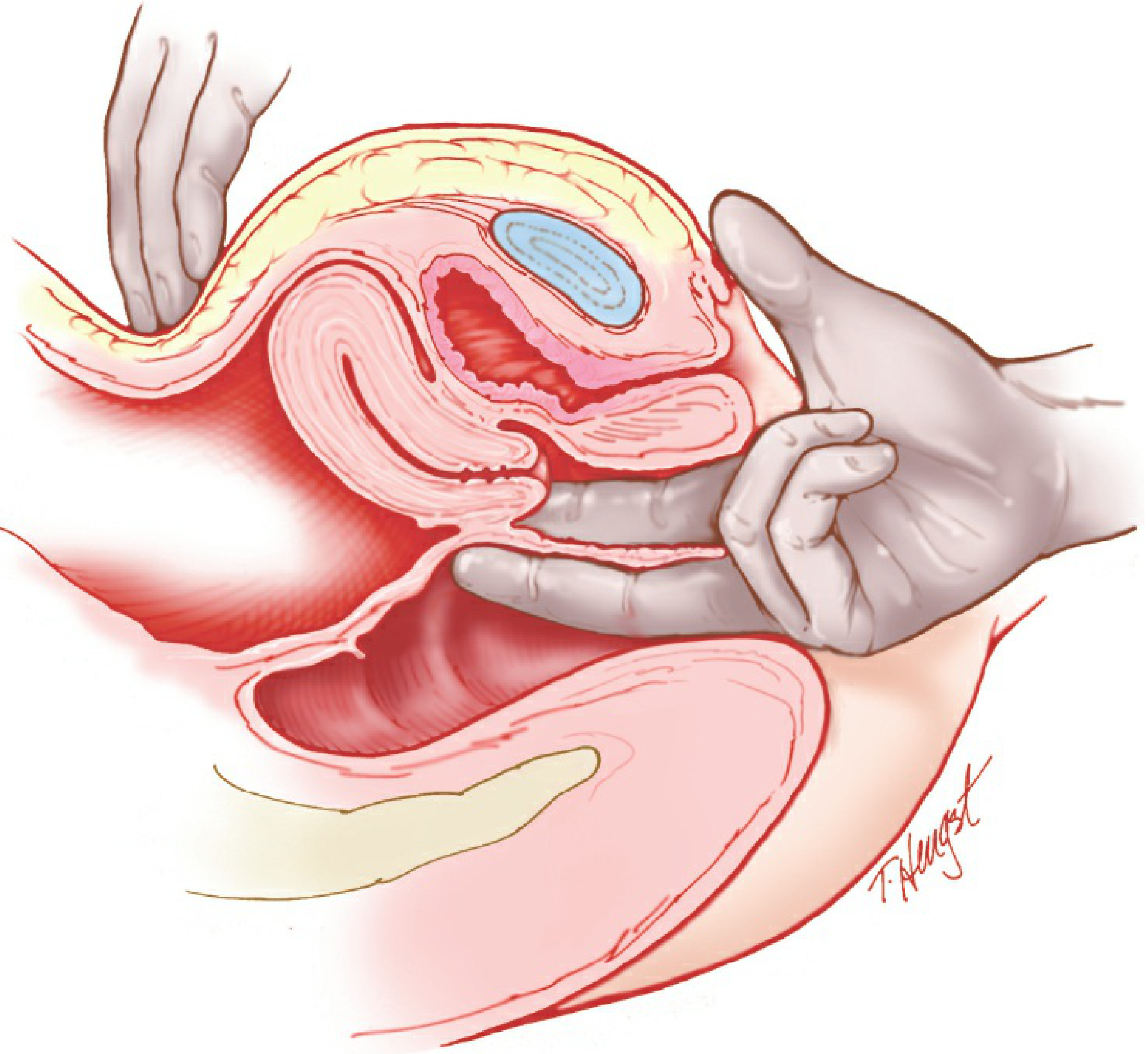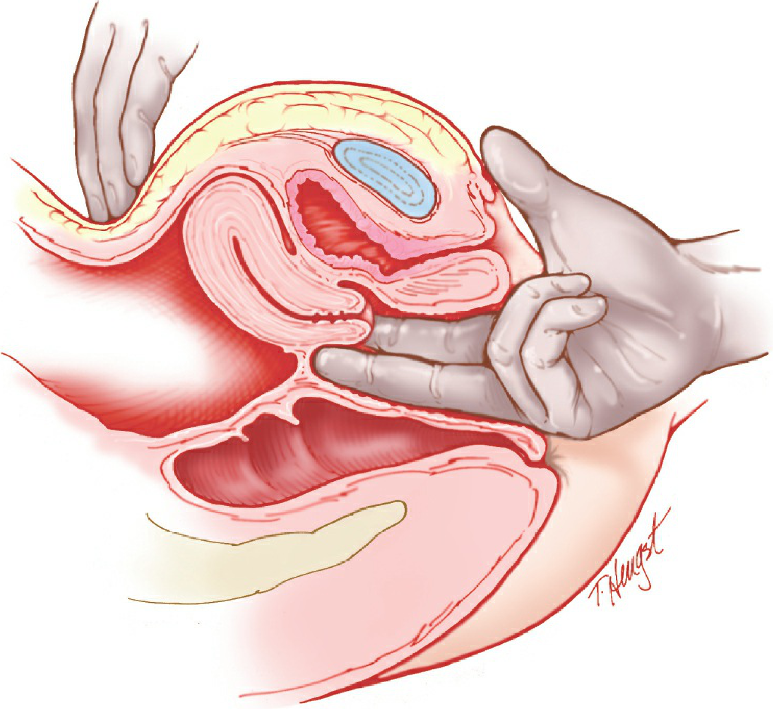 Performed when indicated — one finger in the vagina, one in the rectum: