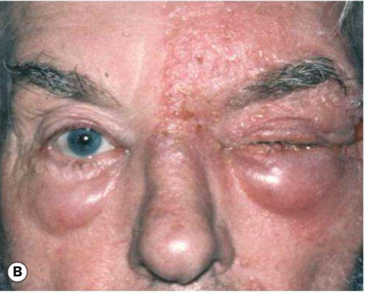| Mild upper eyelid swelling | Boggy periorbital edema typical of early HZO |