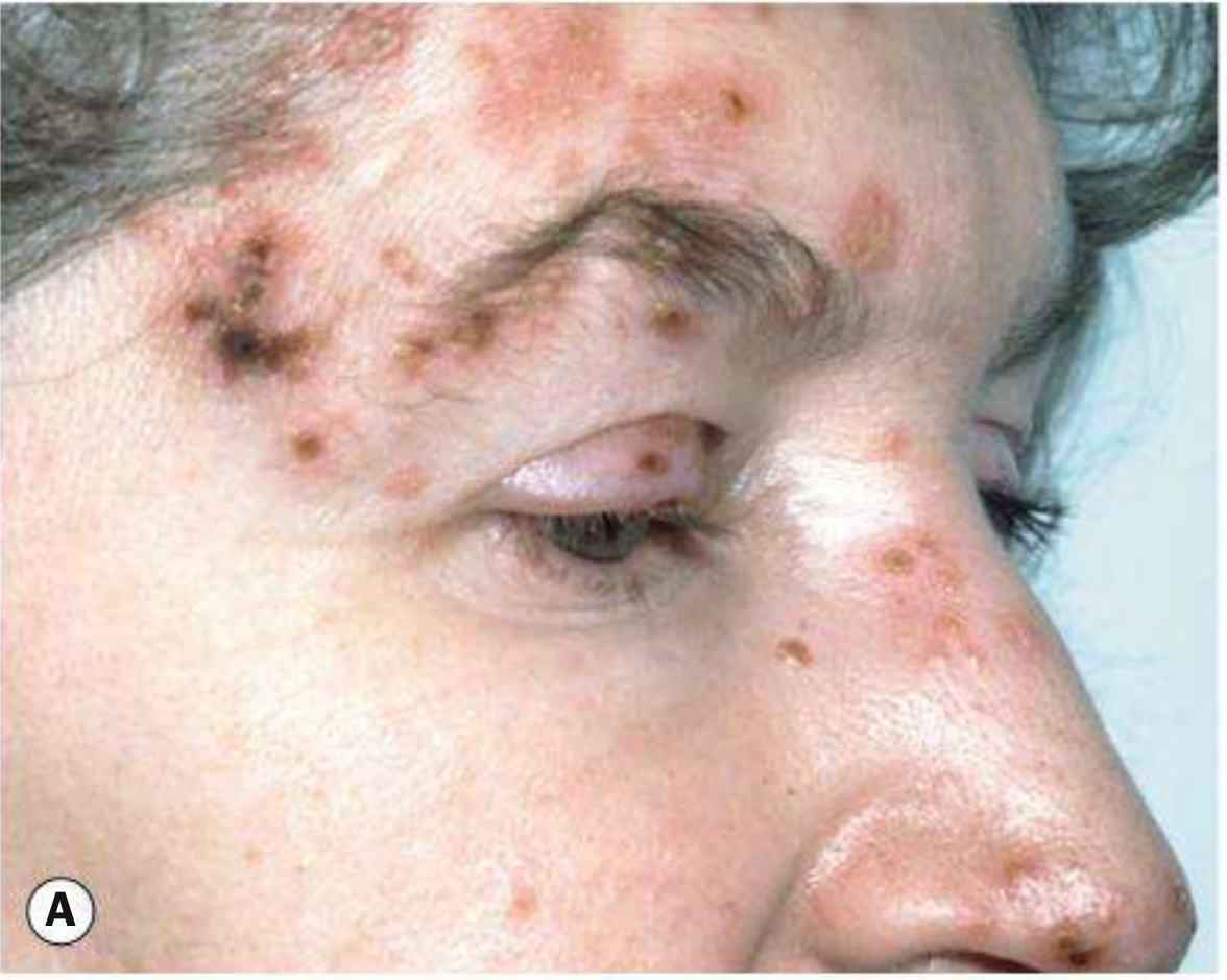 | Unilateral hyperpigmentation at lateral canthus | Early maculopapular/pigmented rash in V1 dermatome |