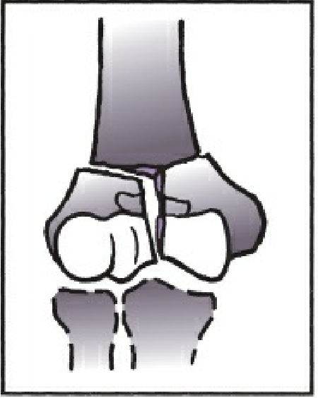 | Divergent condyles | Medial and lateral condyles displaced apart on AP view |