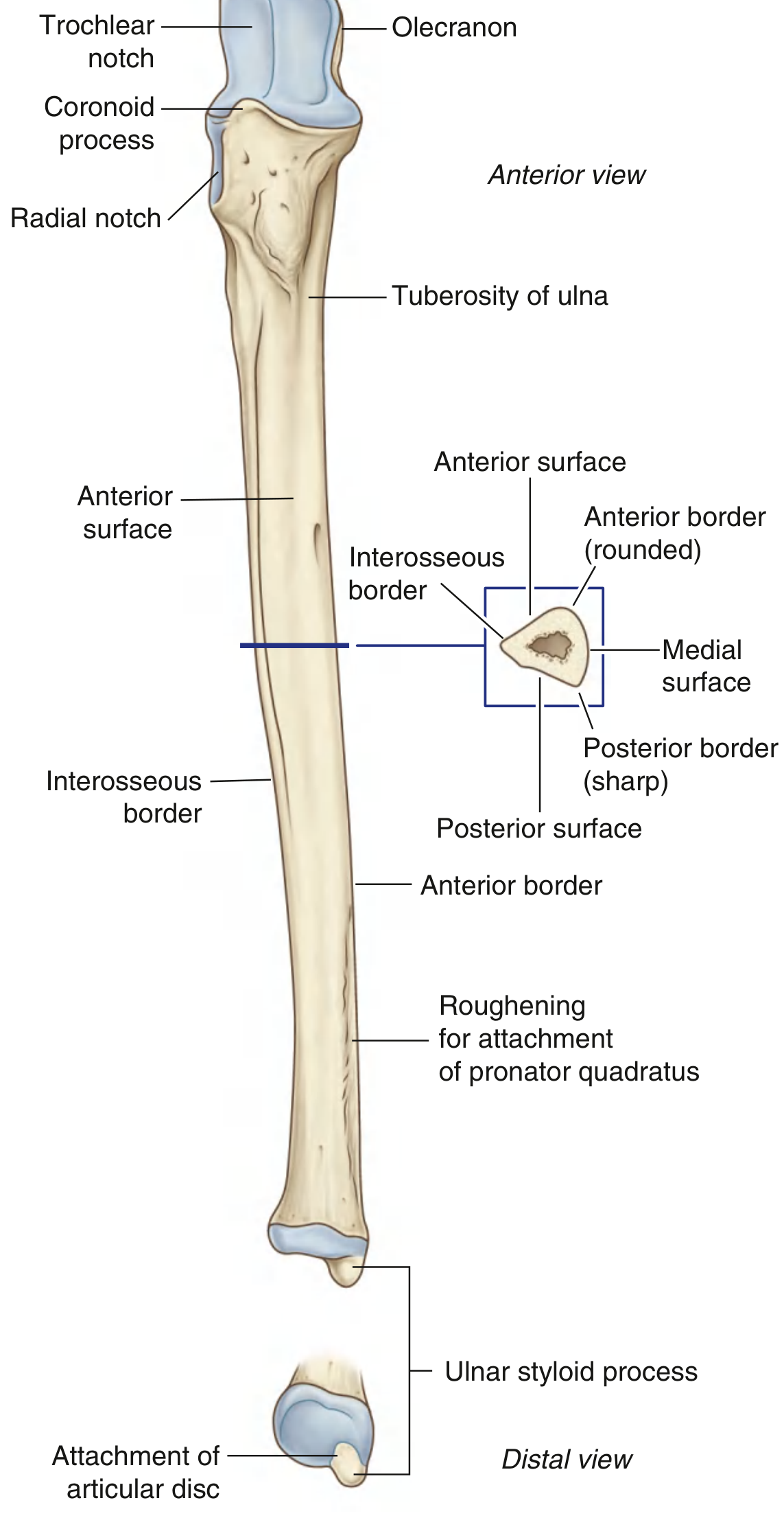 | Anterior border | Smooth and rounded; extends from medial coronoid process to styloid process base | Upper ¾: flexor digitorum profundus; lower ¼: pronator quadratus |
