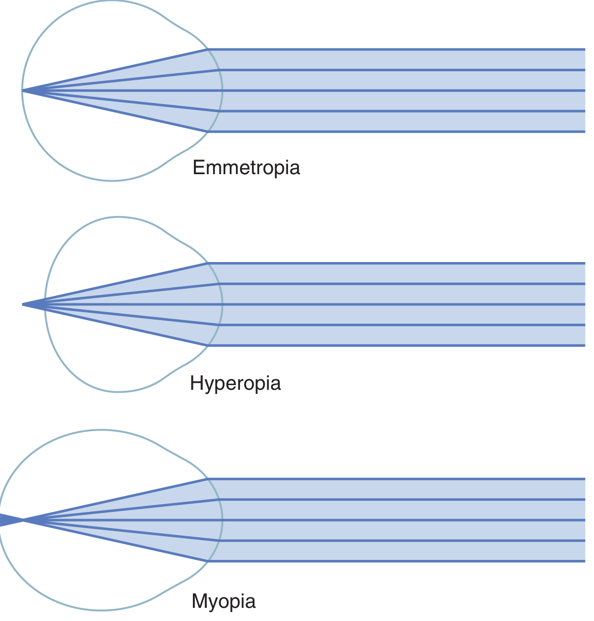 Myopia is a refractive error in which parallel light rays from distant objects converge to a focal point in front of the retina (rather than on it), resulting in blurred distance vision with relatively preserved near vision. It most commonly results from an excessively long axial length of the eyeball, but can also be caused by excessive refractive power in the lens system.