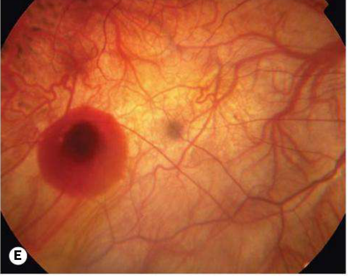 | Fuchs spot | Raised pigmented macular lesion after subretinal haemorrhage absorbs |