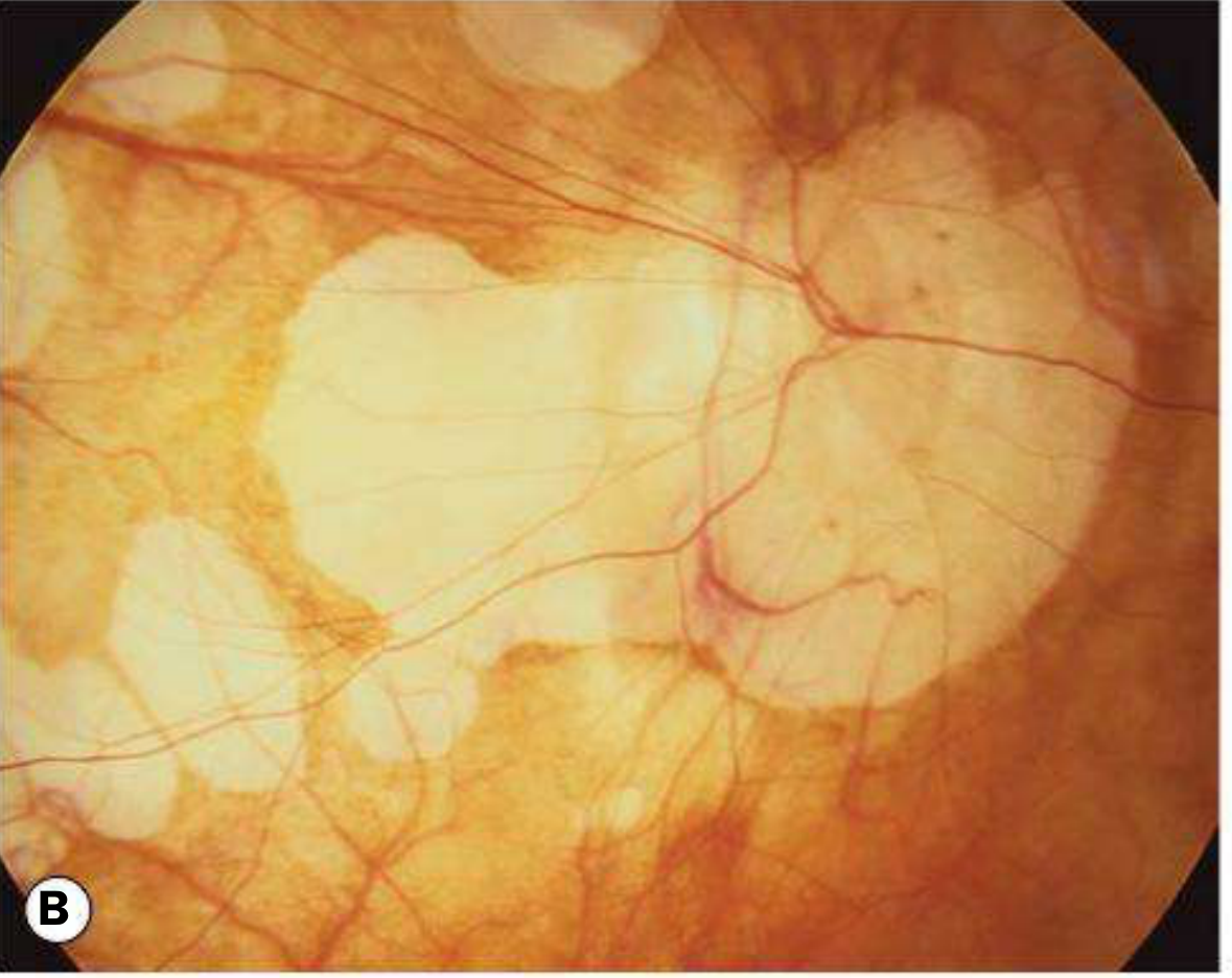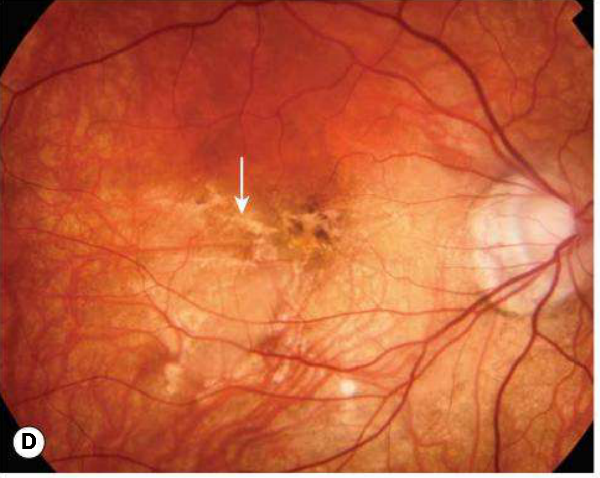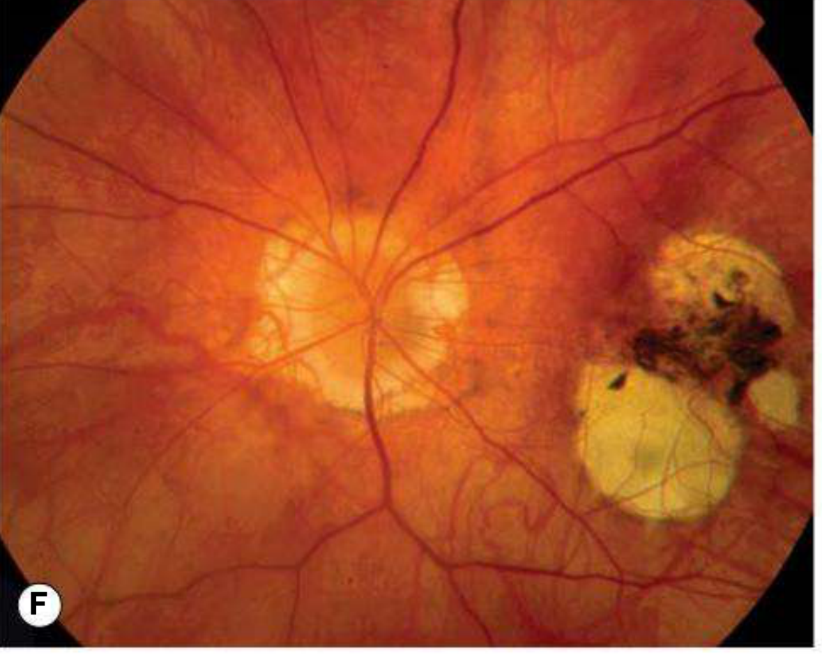 | Focal chorioretinal atrophy | Patchy RPE and choroidal loss |