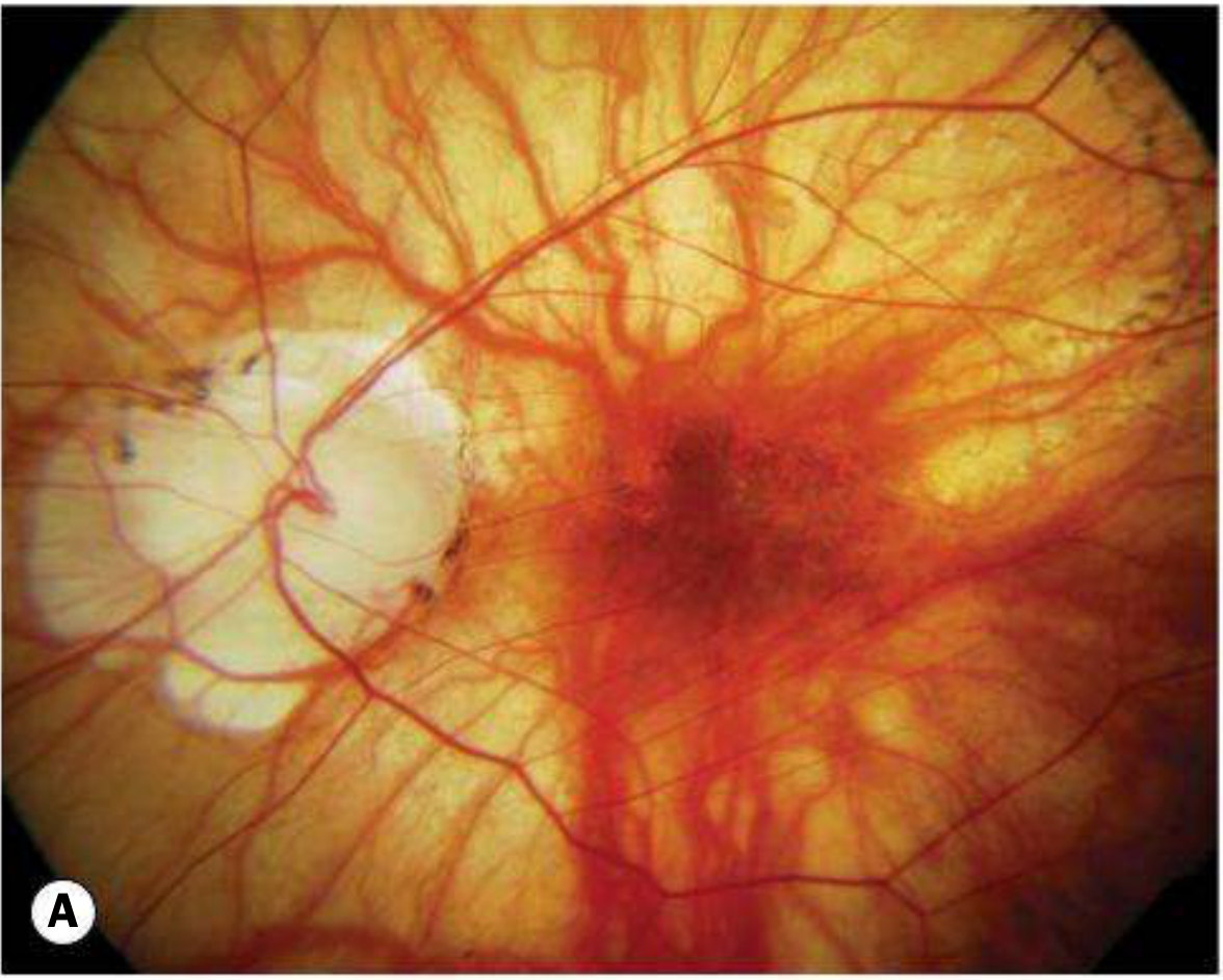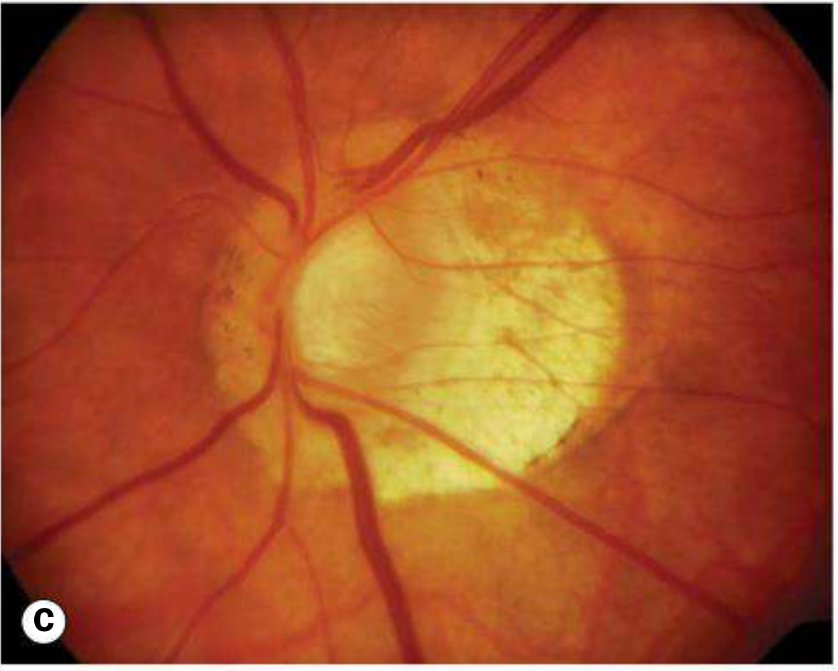 | Peripapillary atrophy | Temporal crescent of thinned/absent RPE |