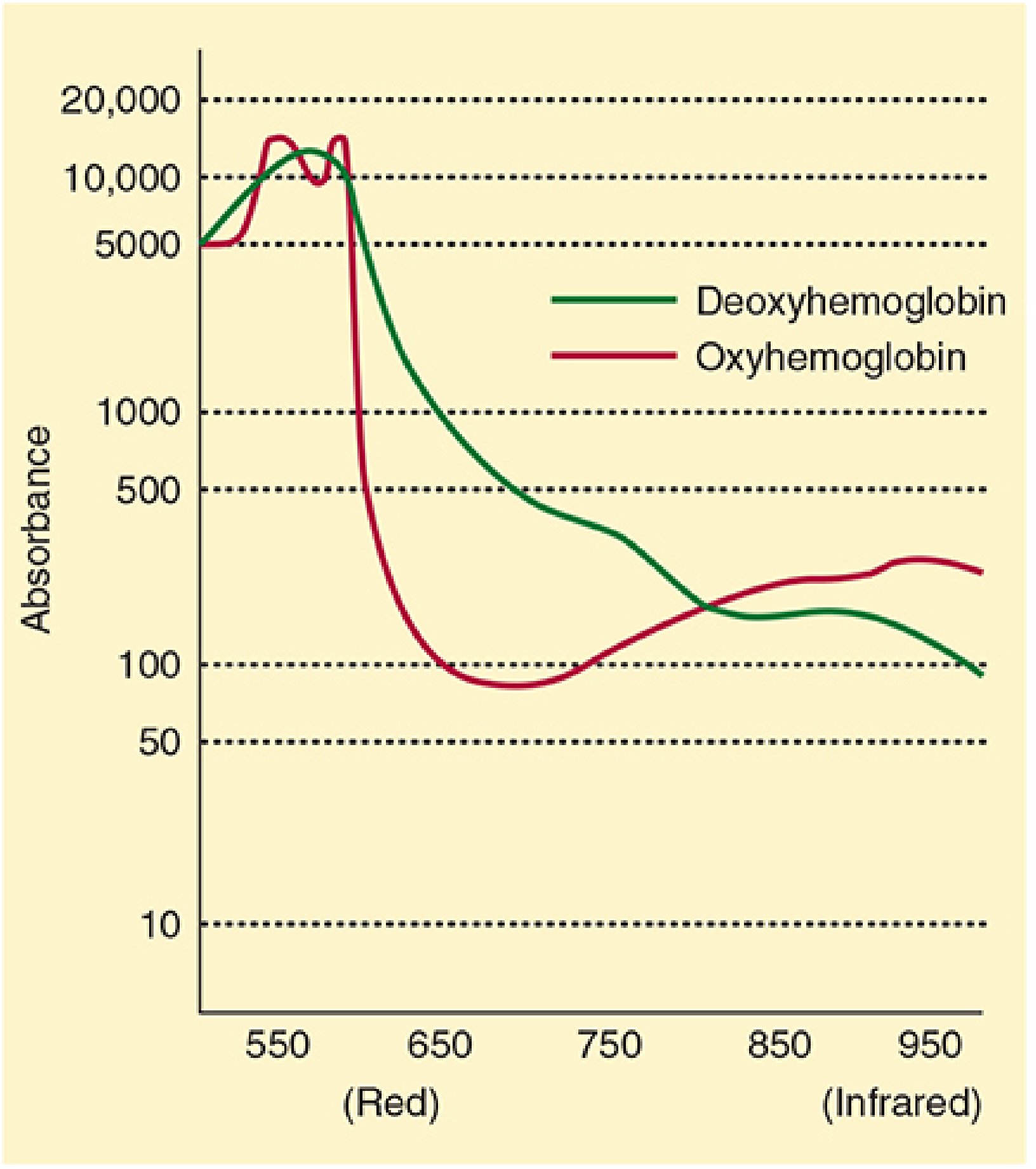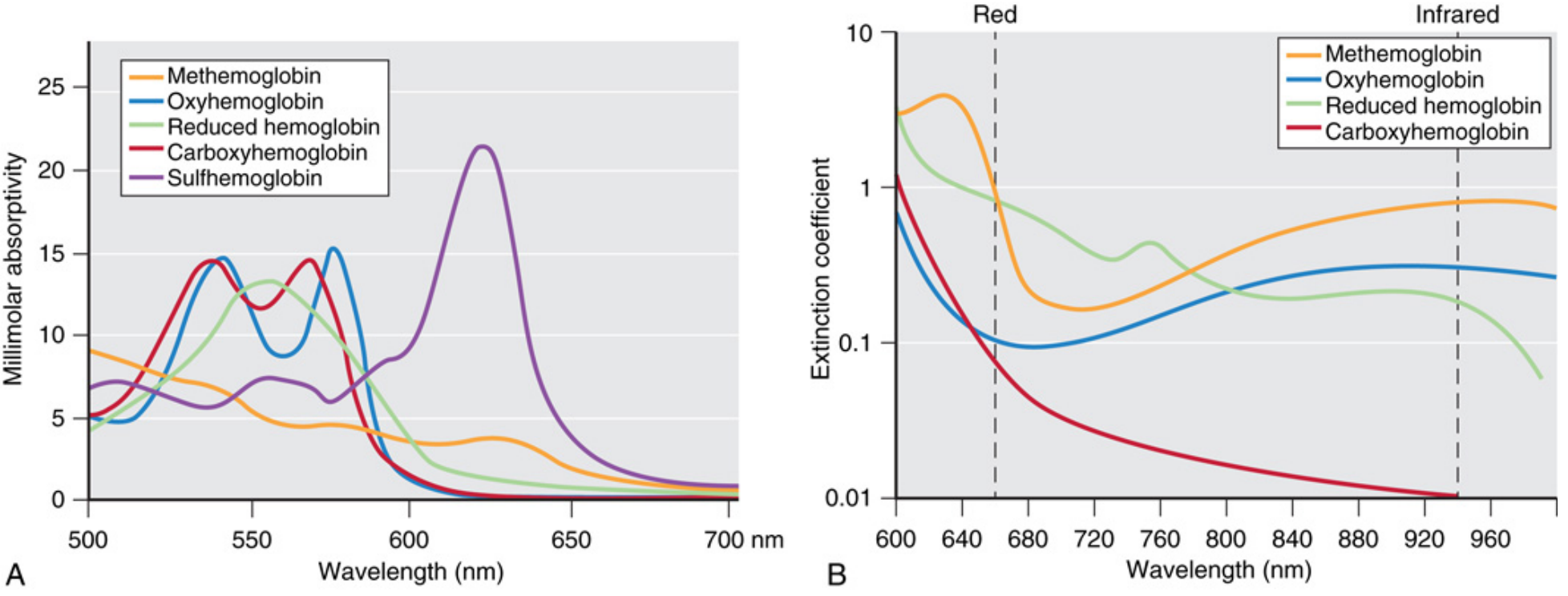 - At 660 nm (red): DeO₂Hb absorbs far more than O₂Hb → deoxygenated blood absorbs red light heavily → appears blue/cyanotic to the naked eye