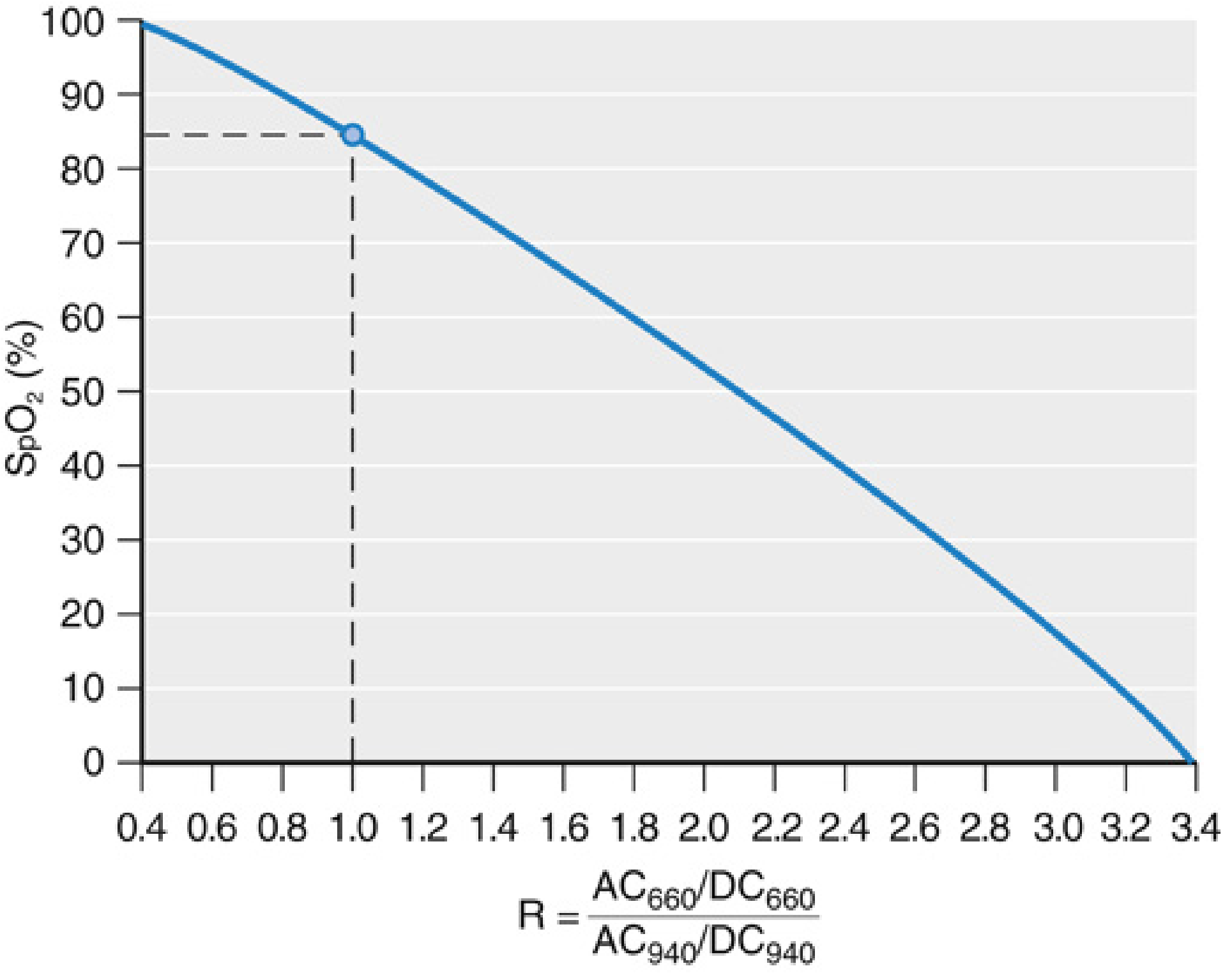 Fig 37.5 — Miller's Anesthesia 10e: Calibration curve. The critical point — when R = 1 (equal absorption at both wavelengths), SpO₂ reads exactly 85%