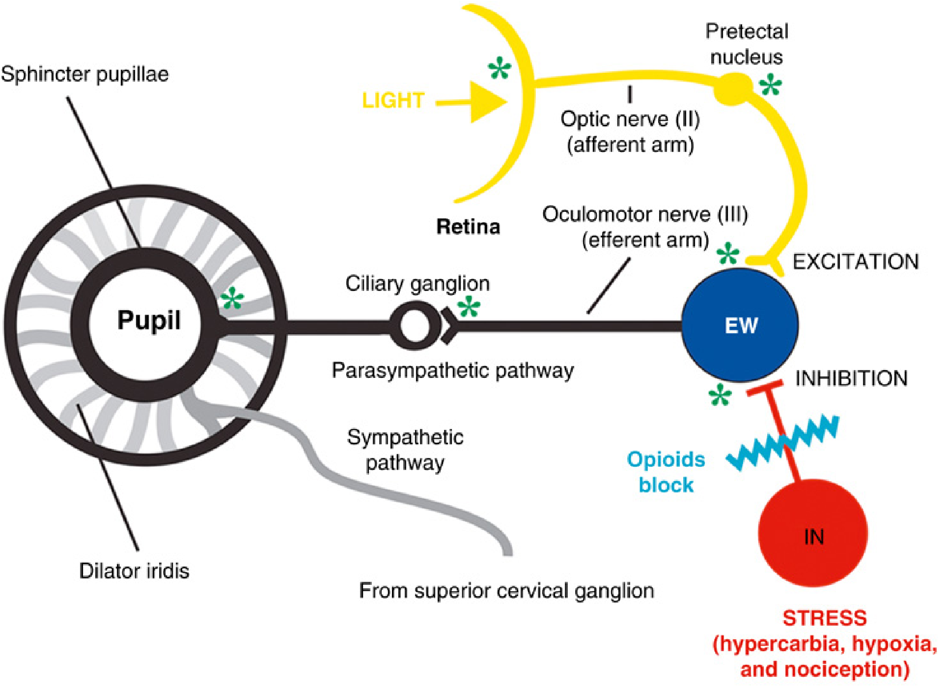 Fig. 22.14 — Miller's Anesthesia, 10th Ed. The EW nucleus neurons are pacemaker cells modified by excitatory (light reflex via optic nerve) and inhibitory inputs (GABAergic interneurons driven by nociception/stress). Opioids block the inhibitory interneuron, disinhibiting the EW nucleus and driving parasympathetic-mediated constriction. Hypercarbia, hypoxia, and nociception all stimulate the inhibitory interneuron and would tend to cause dilation.