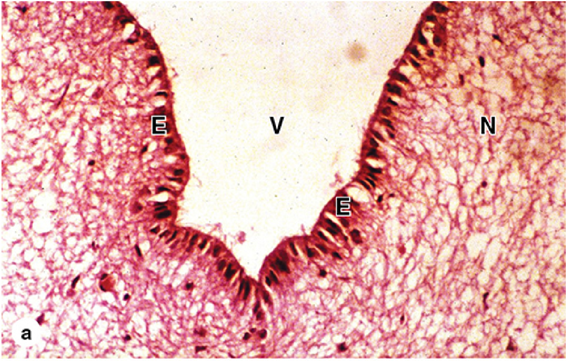 Columnar ependymal cells (E) line the ventricle (V), extending cilia into the lumen. Basal ends taper into the neuropil (N).