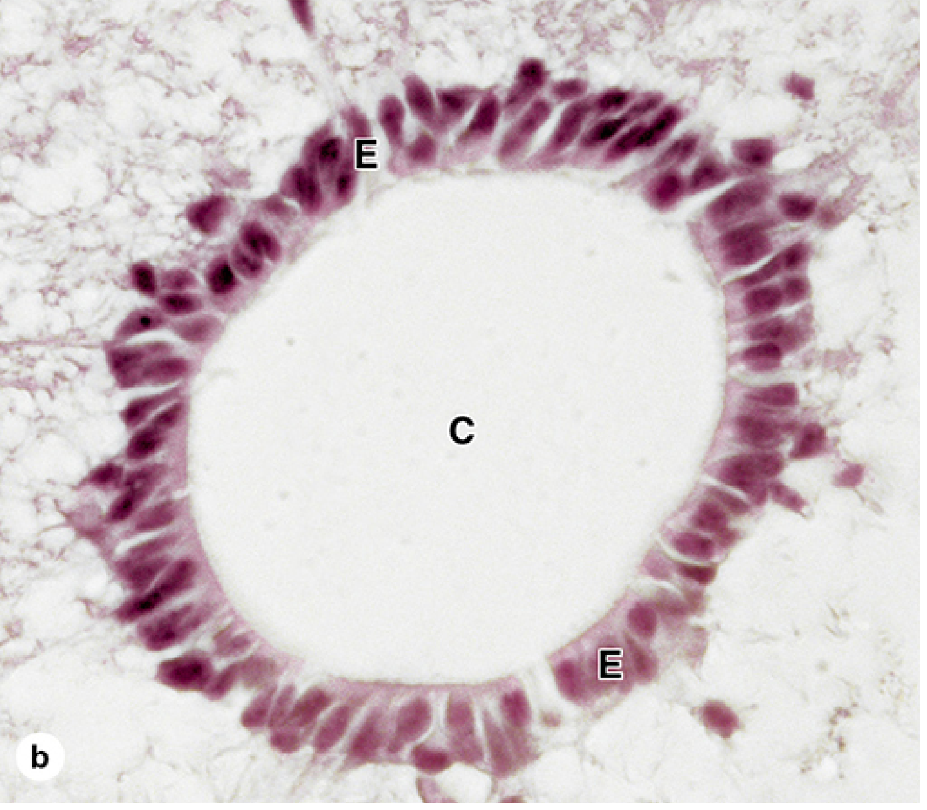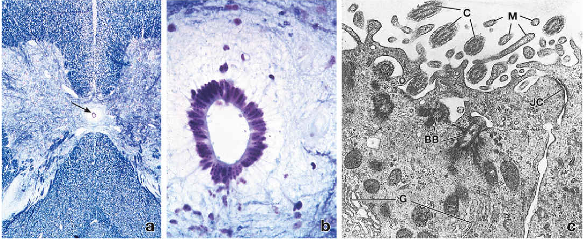 Ependymal cells (E) encircle the central canal (C) in a perfect single-layered ring with prominent apical cilia.