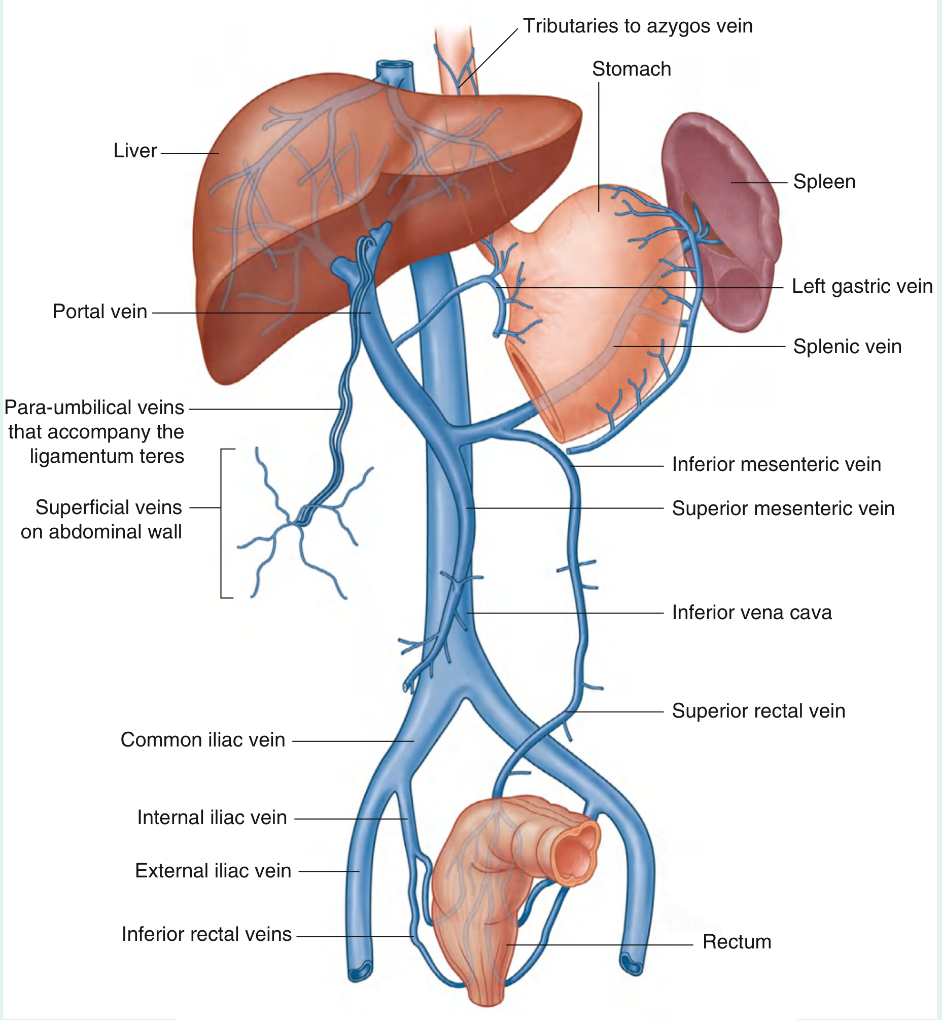 | Superior rectal vein (IMA tributary → portal) | Middle and inferior rectal veins → internal iliac → IVC |