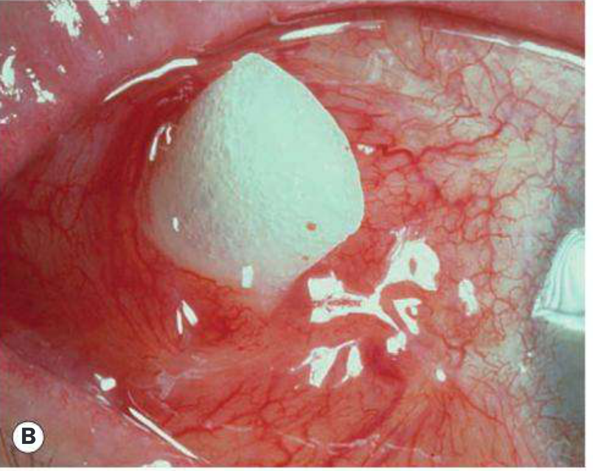- Buckle extrusion — implant erodes through conjunctiva and becomes exposed (Fig. 16.32A — shows visible buckle material under conjunctiva)