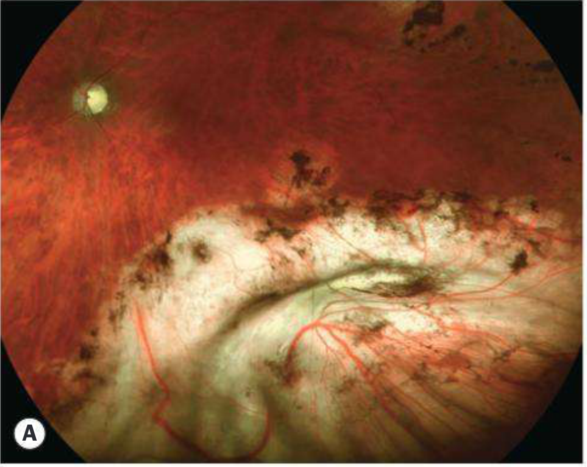 Fig. 16.29 — Wide-field fundus view showing the buckle effect (A) radial explant; (B) circumferential explant