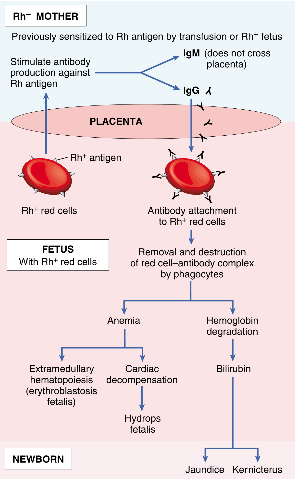 When an Rh(D)-negative mother carries an Rh(D)-positive fetus, fetal red cells can enter maternal circulation (fetomaternal hemorrhage), especially during delivery or trauma. This triggers the mother's immune system to produce anti-D antibodies (initially IgM — which don't cross the placenta — then IgG on subsequent exposure).