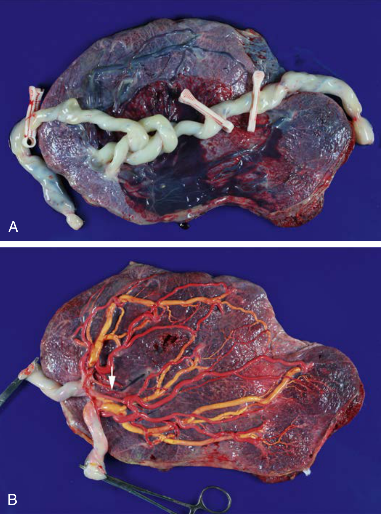 Monoamniotic twin placenta: closely inserted, entangled umbilical cords (Creasy & Resnik)