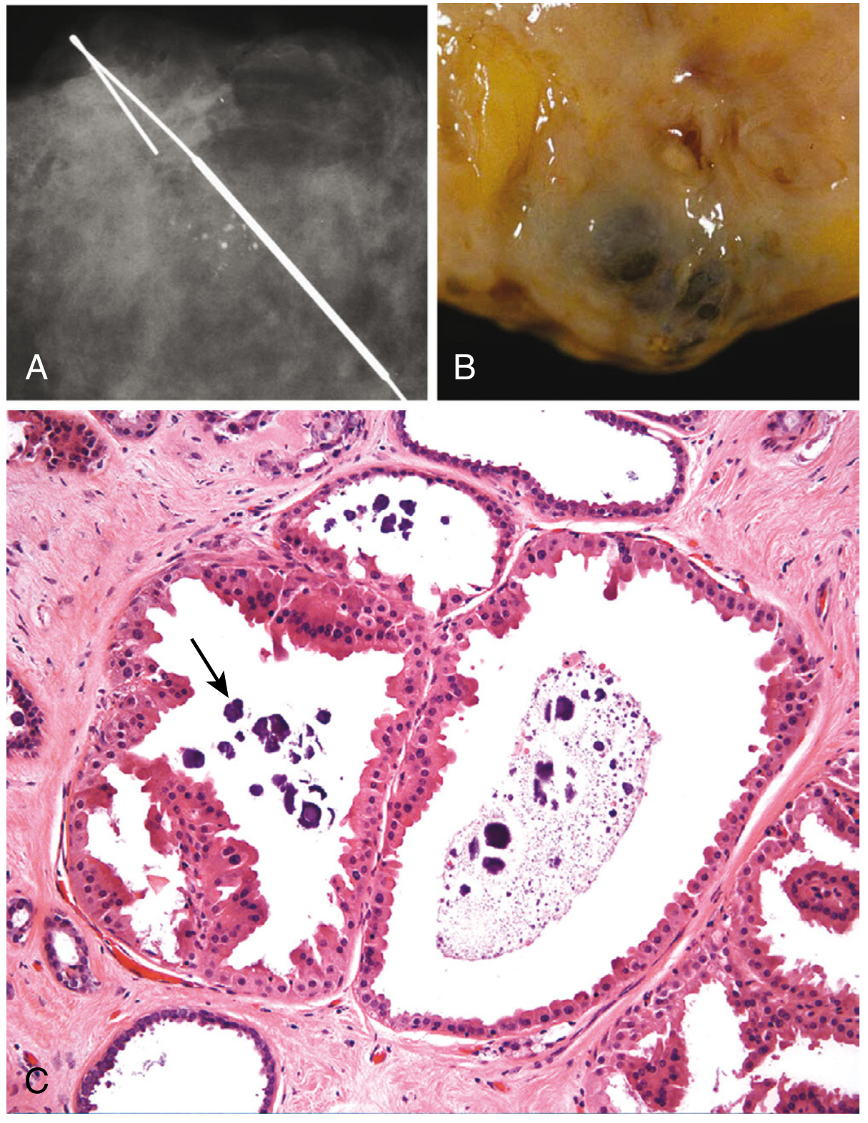 Fig. — Apocrine cysts in fibrocystic change. (A) Clustered rounded calcifications on specimen radiograph. (B) Gross appearance — dark turbid "blue-dome" fluid. (C) Histology: apocrine cells with granular eosinophilic cytoplasm; arrow = intraluminal calcifications. — Robbins, Cotran & Kumar Pathologic Basis of Disease, p. 964