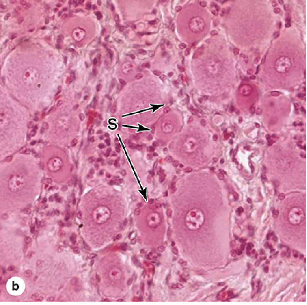 Fig (b): Satellite cells (S) forming sheetlike envelopes around large sensory neuronal cell bodies — H&E ×400
