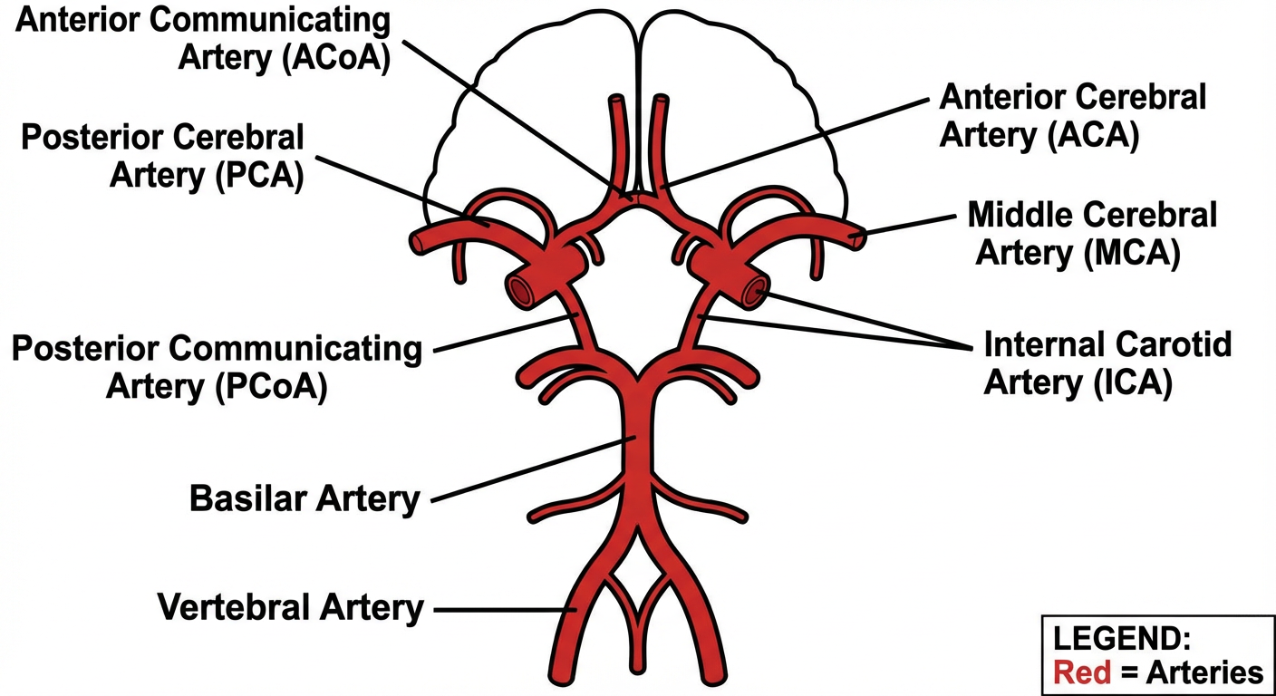 ACoA — Anterior Communicating Artery (bridges the two ACAs at the midline)
